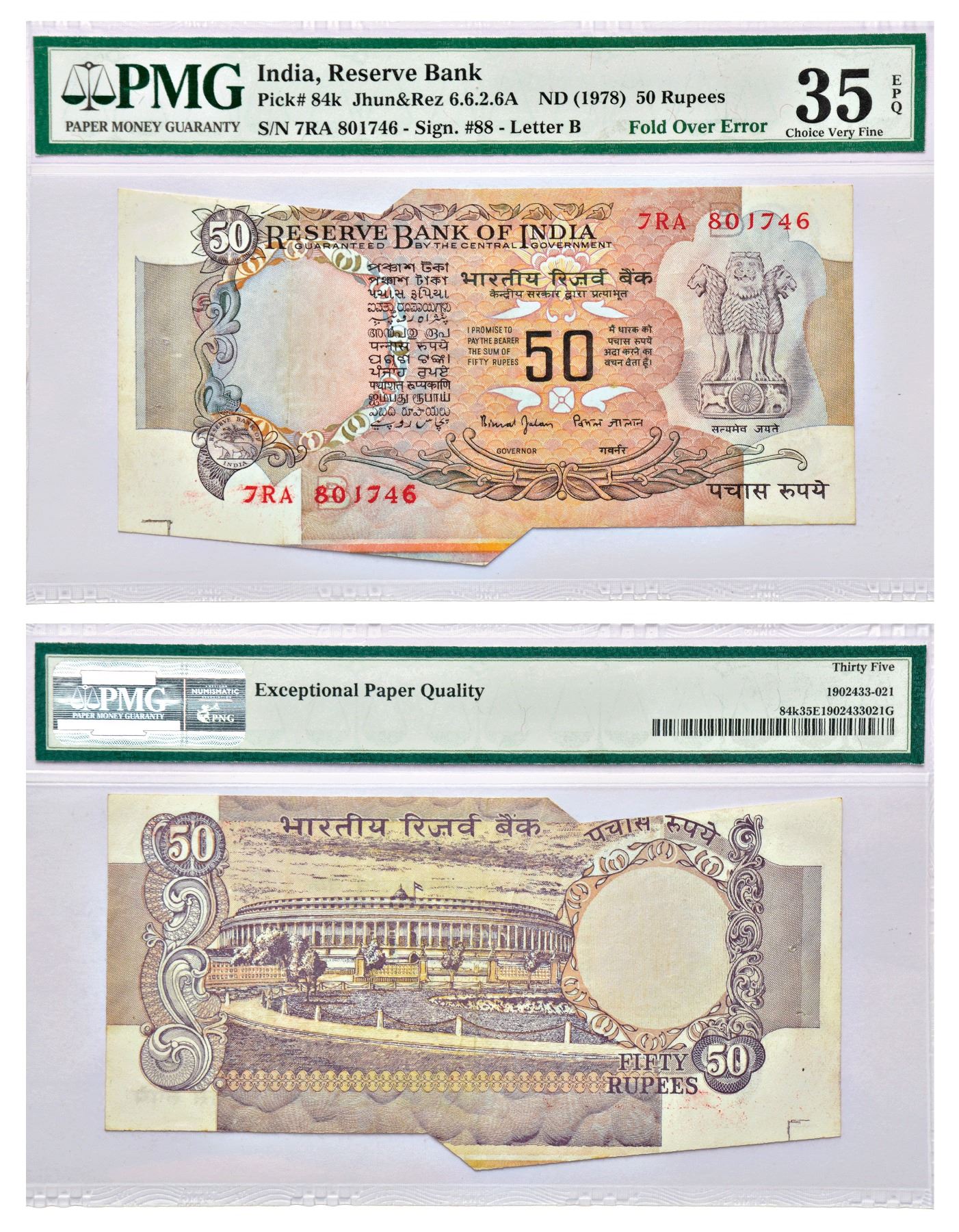 50 rupees, misprint, Parliament series, ND (1997-2003), signed by Bimal Jalan, inset 'B', serial no.: 7RA 801746, extra paper on left side due to misaligned cutting.