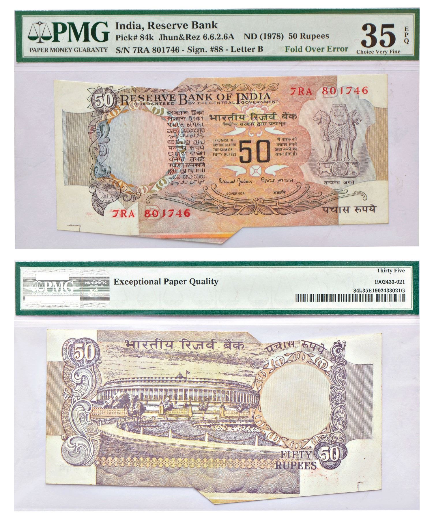 Paper Money: 50 rupees, misprint, Parliament series, ND (1997-2003), signed by Bimal Jalan, inset 'B', serial no.: 7RA 801746, extra paper on left side due to misaligned cutting.