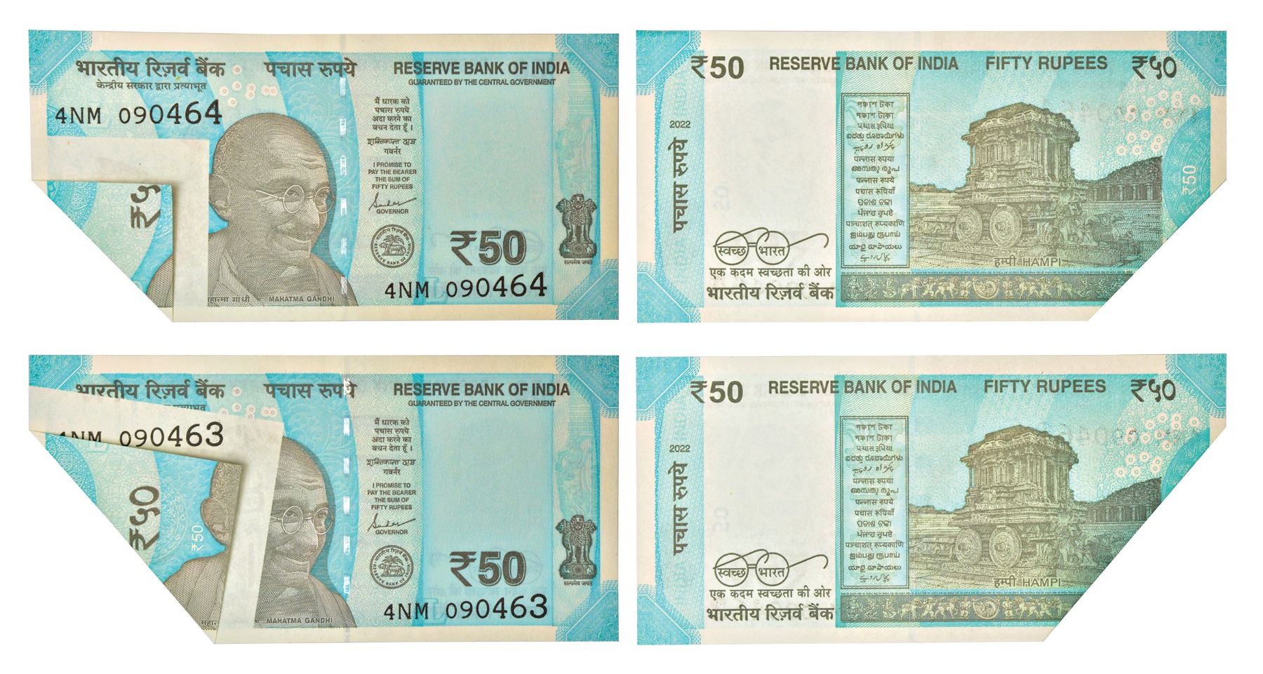 50 rupees, misprint notes (2), new Gandhi series, 2022, signed by Shaktikanta Das, inset 'L', telescopic consecutive serial nos.: 4NM 090463 and 090464, flip error on obverse. (2 notes)