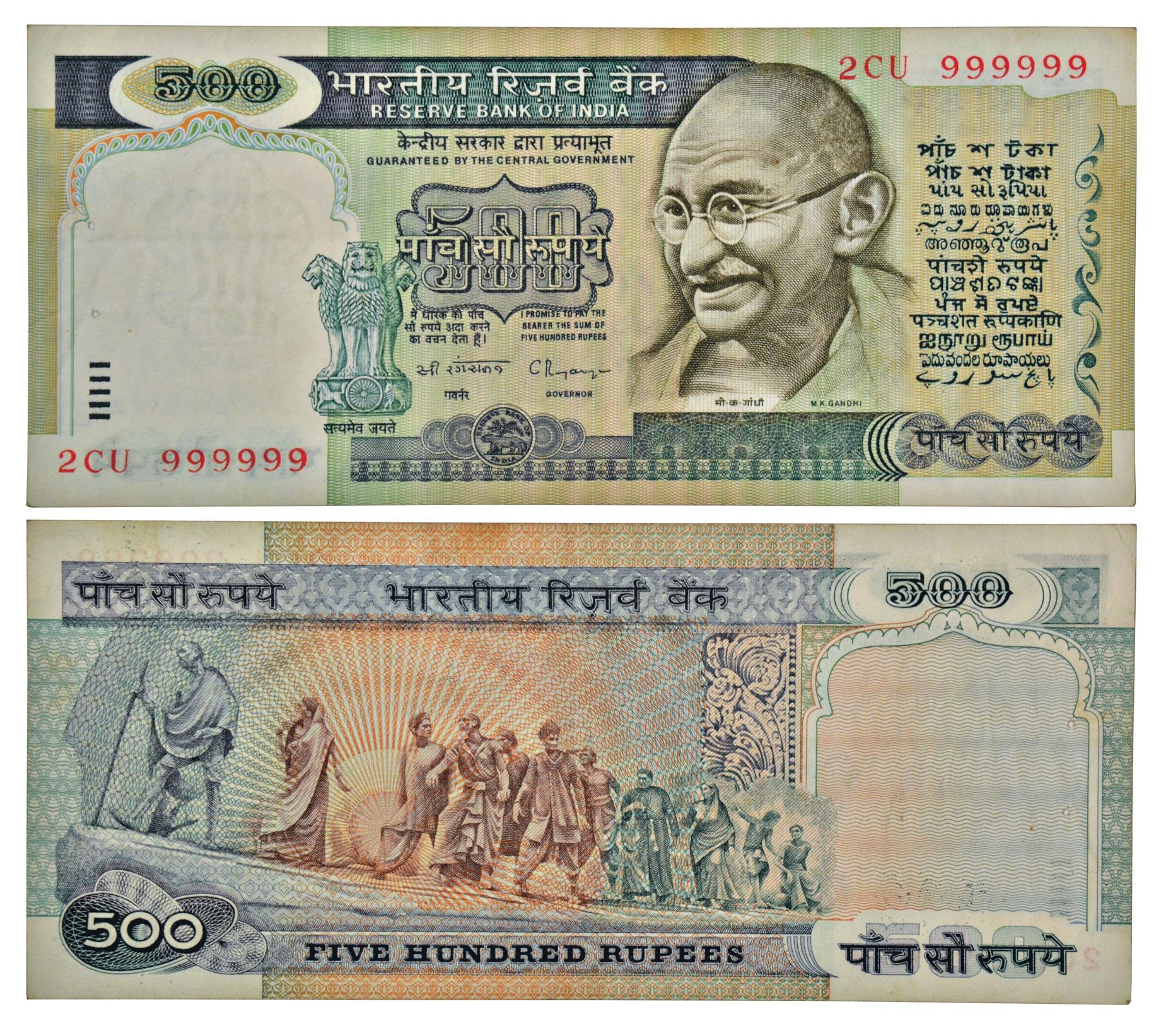 500 rupees, 1st issue, fancy number, ND (1992-1997), signed by C. Rangarajan, without inset, serial no.: 2CU 999999. J&R 6.8.1.3, slight crease in watermark.