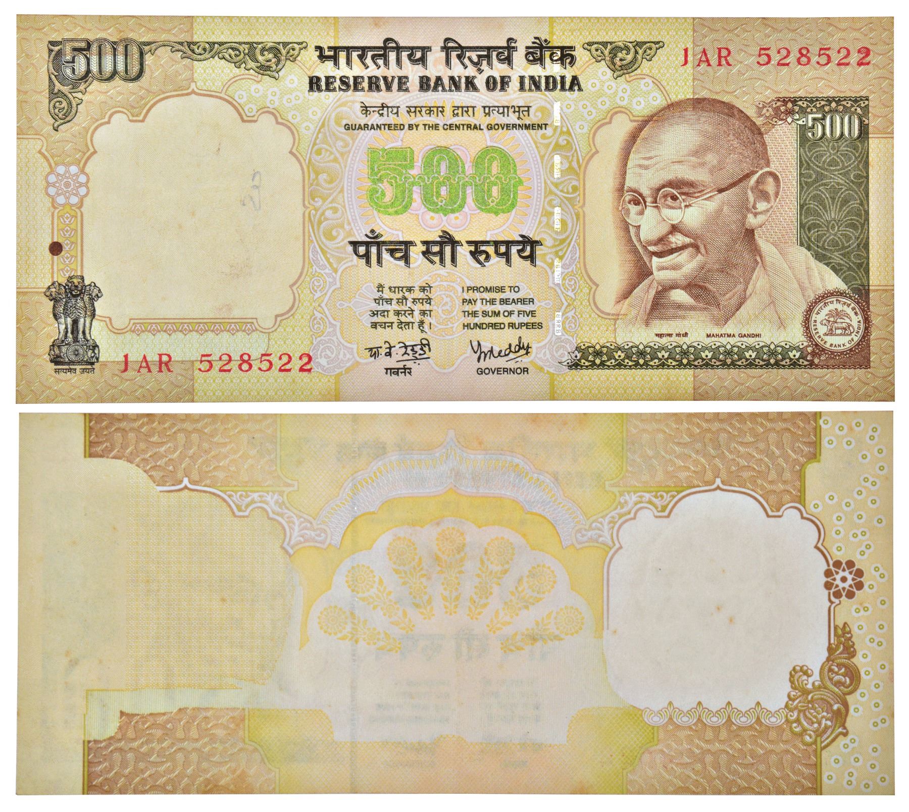 500 rupees, 3rd issue, misprint, ND (2003-2008), signed by Y.V. Reddy, without inset, serial no.: 1AR 528522, reverse major colours missing and all text missing.