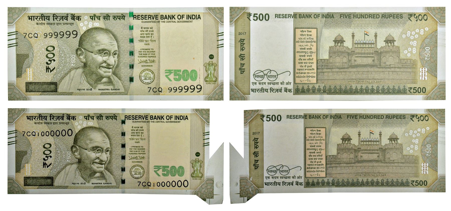 500 rupees, 4th issue, fancy number misprint note (2), 2017, signed by Urjit R. Patel, inset 'F', serial no.: 7CQ 999999 (normal fancy number note) and 7CQ 1000000 (1 million), extra paper on lower right side, slight tattered at extra paper. (2 notes)