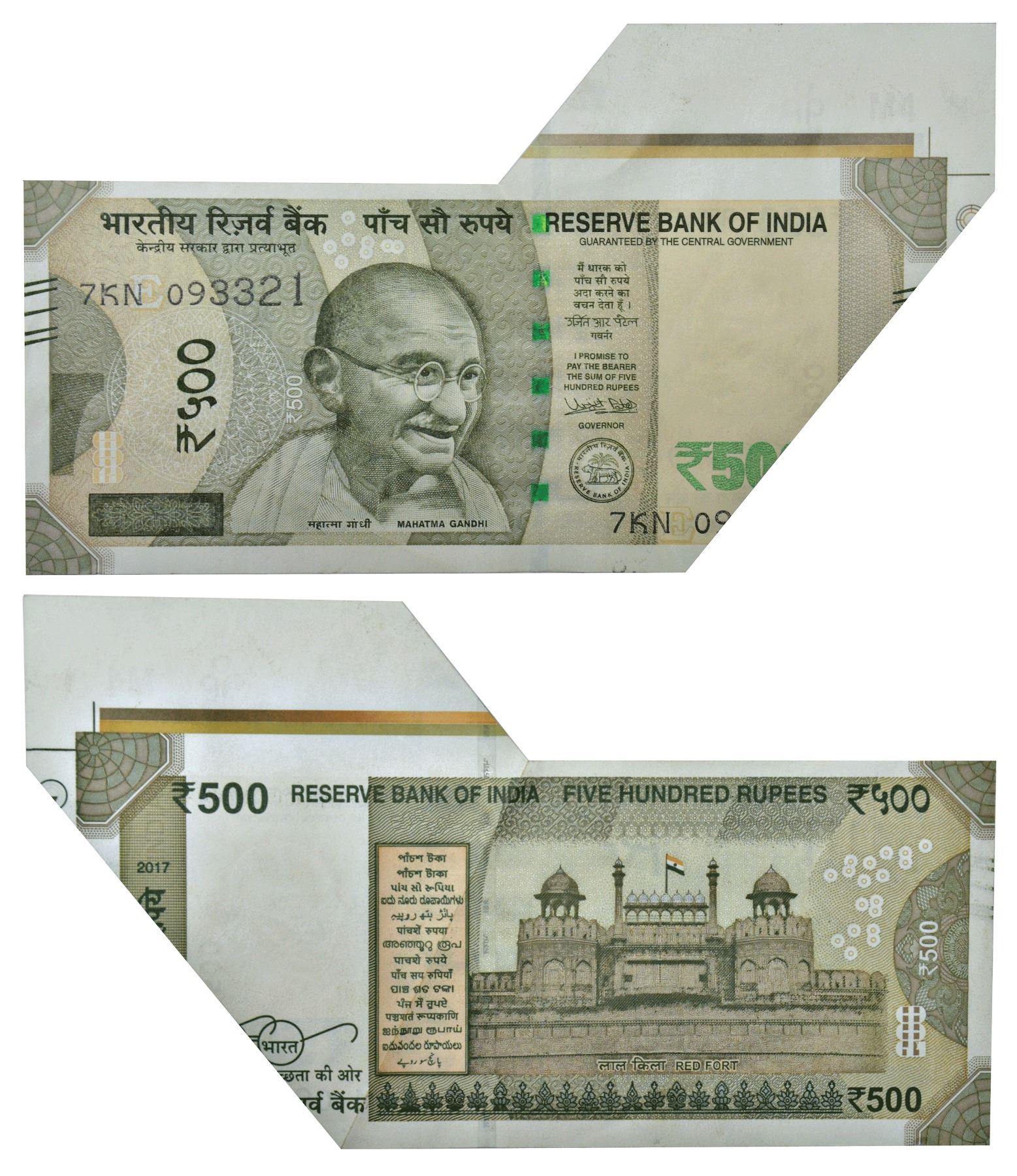 500 rupees, 4th issue, misprint, 2017, signed by Urjit Patel, inset 'E', serial no.: 7KN 093321, misaligned cutting and extra paper on upper right side.