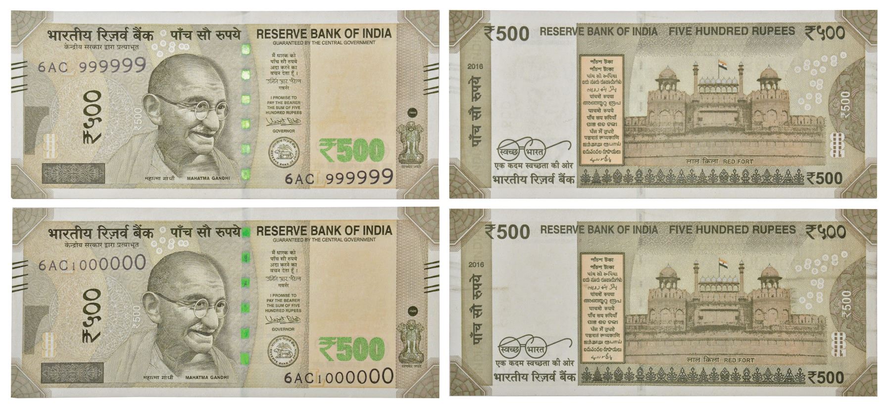 500 rupees, fancy number set of 2 notes, New Gandhi series, 2016, signed by Urjit Patel, inset 'L', telescopic serial no.: 6AC 999999 and 6AC 1000000 (1 million). (2 notes)