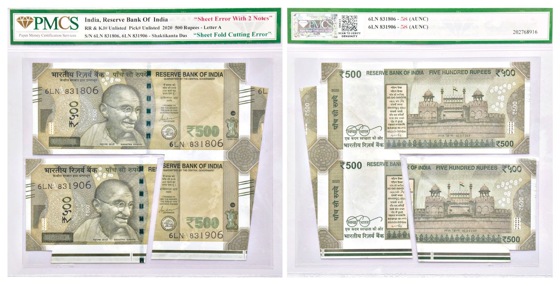 500 rupees, misprint notes (2), new Gandhi series, 2020, signed by Shaktikanta Das, inset 'A', telescopic serial nos.: 6LN 831806 and 831906; Sheet fold cutting error. (2 notes)