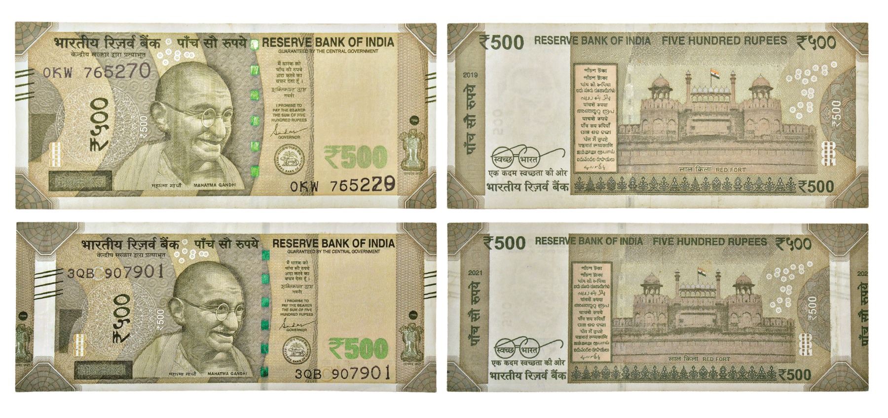 500 rupees, misprint notes (2), new Gandhi series, signed by Shaktikanta Das, 1x 2019, serial no.: 0KW 765270 and 755229, two different serial numbers printed one over another on lower corner and 1x 2021, serial no.: 3QB 907901, extra note on left side attached with this note due to cutting error.(2 notes)