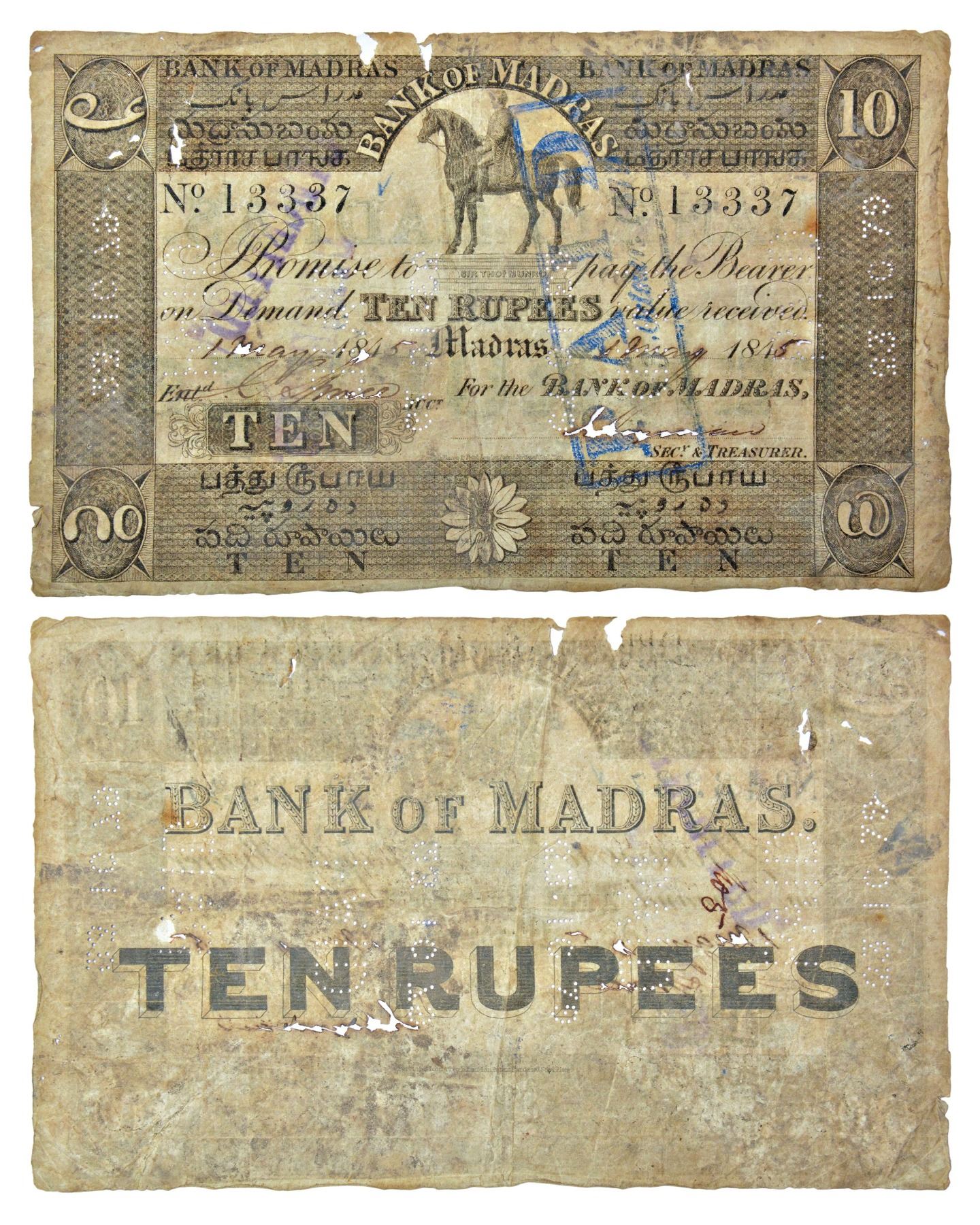 Paper Money: Bank of Madras, 10 rupees, hand signed, dated 1 May 1845 of date format 184_, Plate type 1, serial no.: 13337, signed by John Heyman. Obv: BANK OF MADRAS in semi-circular on top, above the Vignette of Equestrian statue of Sir Thomas Munroe, Governor of Madras. Denominations in numerals on 4 corners, Bank of Madras written on top 2 panels in English, Persian, Telugu and Tamil and Denominations written on bottom 2 panels in the same 4 languages; serial no. 13337 printed on both halves; A large blue stamp PAID 23 October 1879 and CANCELLED stamps across. Rev: BANK OF MADRAS and denomination in big bold fonts, J&R 1C.3.1.1. Printed by Perkins, Bacon & Petch, London. Perforated 23 10 79.