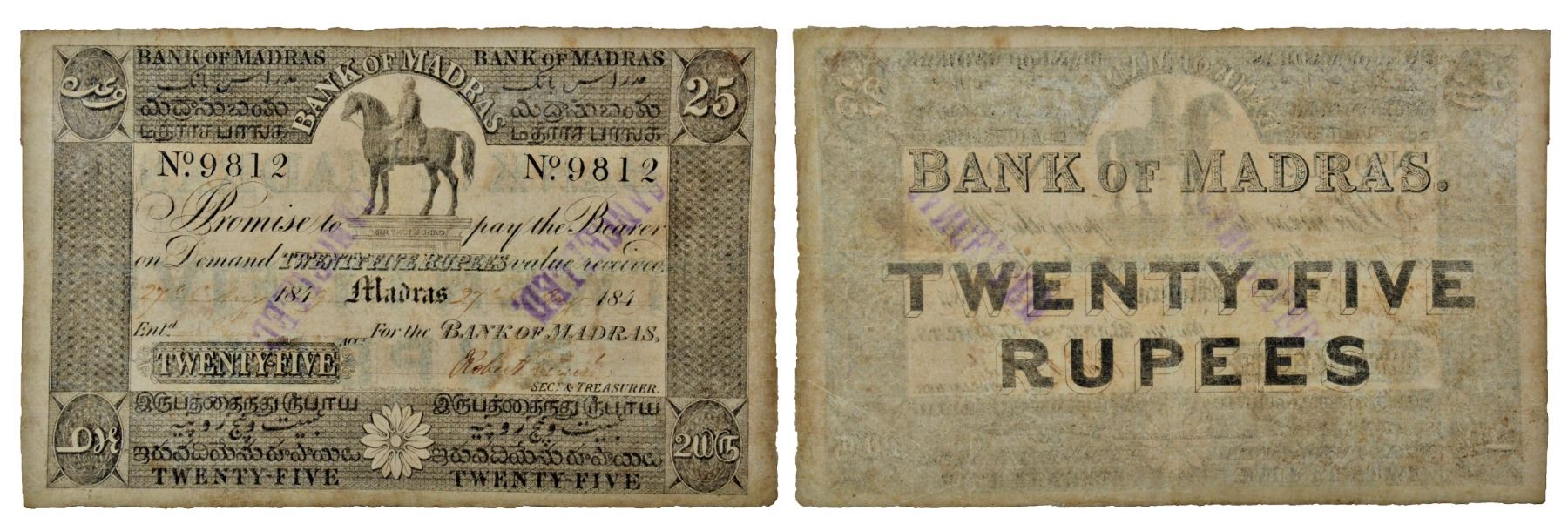 Bank of Madras, 25 rupees, hand signed, dated 27th August 1849 of date format 184_, type 1, serial no.: 9812. Obv: BANK OF MADRAS in semicircular on top, above the Vignette of Equestrian statue of Sir Thomas Munroe, Governor of Madras. Denominations in numerals on 4 corners, Bank of Madras written on top 2 panels in English, Persian, Telugu & Tamil and Denominations written on bottom 2 panels in the same 4 languages. Printed Serial 9812 on both halves. Manuscript Signature of Secy. & Treasurer, Robert Hunter. Printed by Perkins, Bacon & Petch, London. Rev: BANK OF MADRAS in big bold fonts and Denomination in big bold words, J&R 1C.3.1.4.
