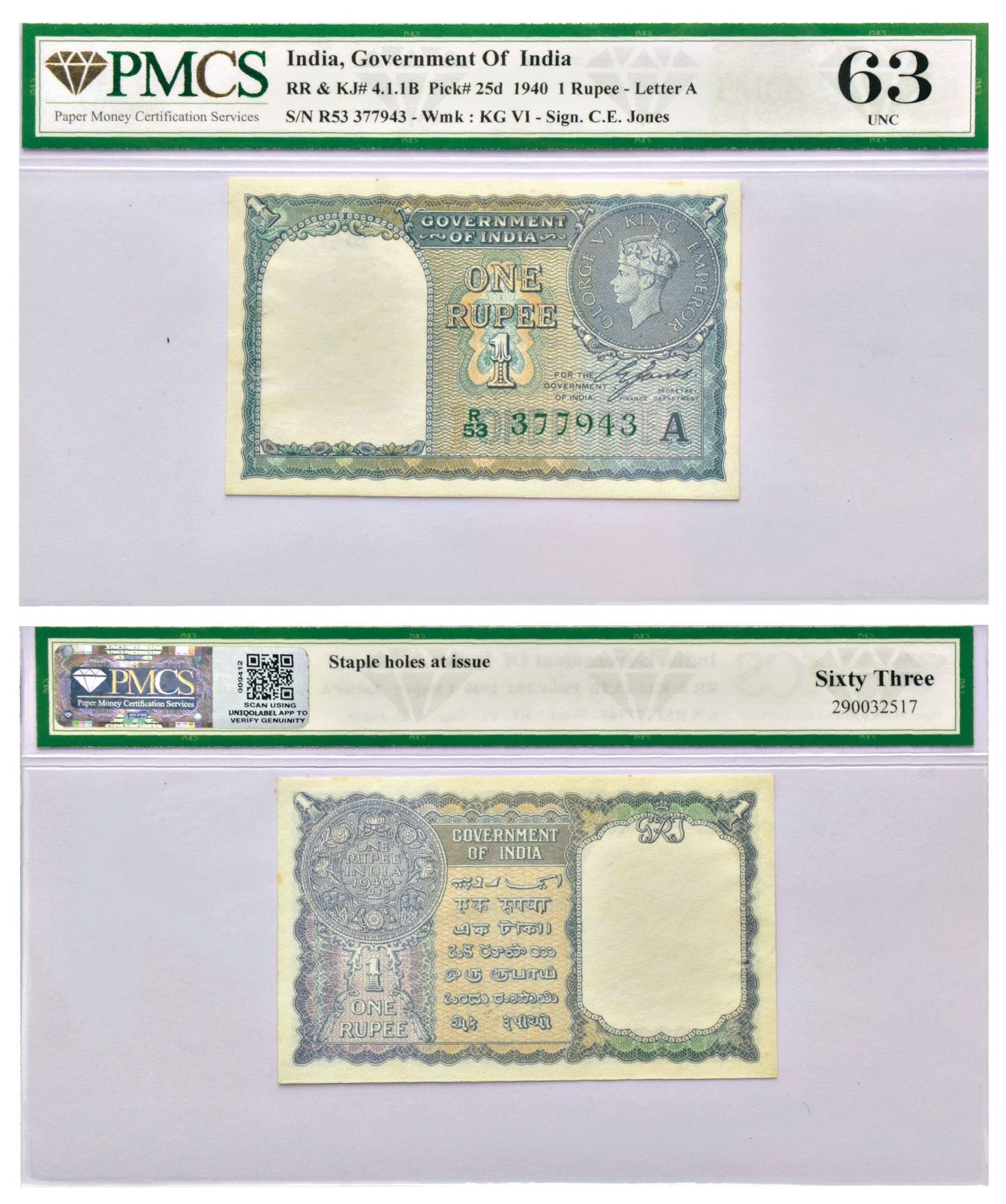 British India, George VI, 1 rupee, 1940, signed by C.E. Jones, inset 'A', serial no.: R53 377943 in green, J&R 4.1.1B.