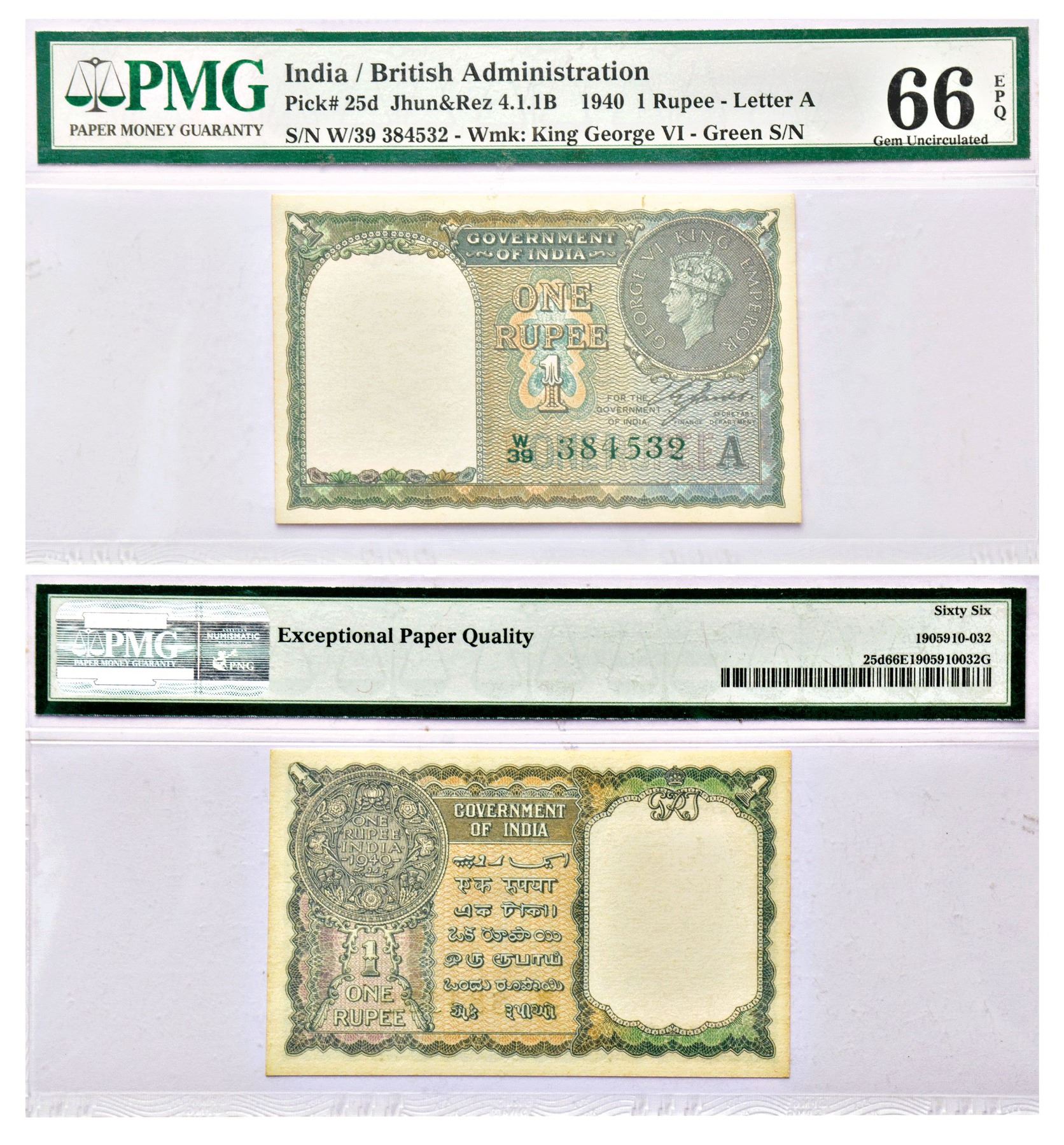 British India, George VI, 1 rupee, 1940, signed by C.E. Jones, inset 'A', serial no.: W39 384532 in green, J&R 4.1.1B.