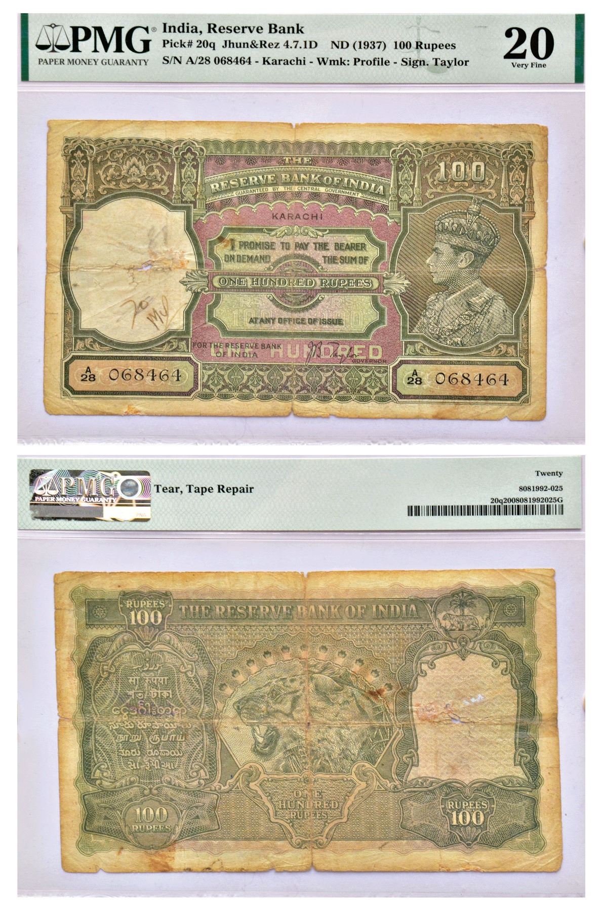 British India, George VI, 100 rupees, ND (1938), Karachi circle, signed by J.B. Taylor, serial no.: A28 068464, watermark 'Profile head'. J&R 4.7.1D.