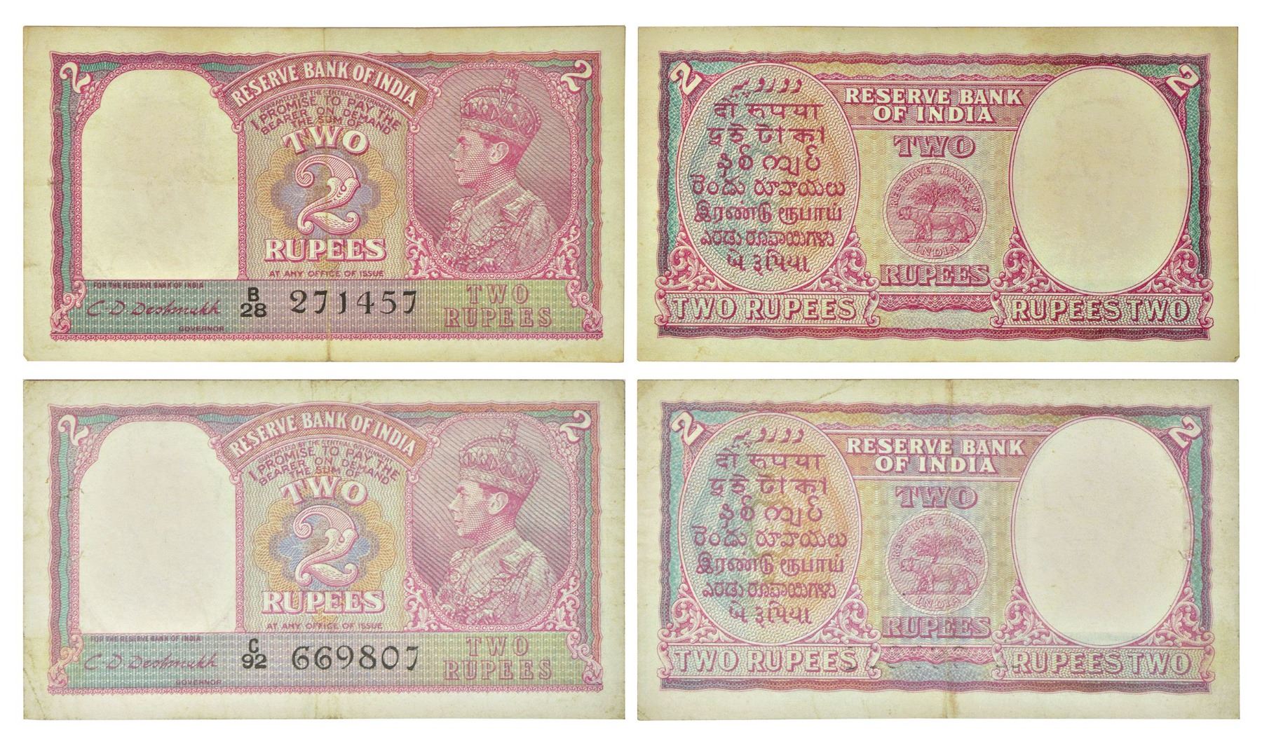 British India, George VI, 2 rupees (2), ND (1943), signed by C.D. Deshmukh, serial nos.: B28 271457 and C92 669807 in black, J&R 4.2.2. (2 notes)