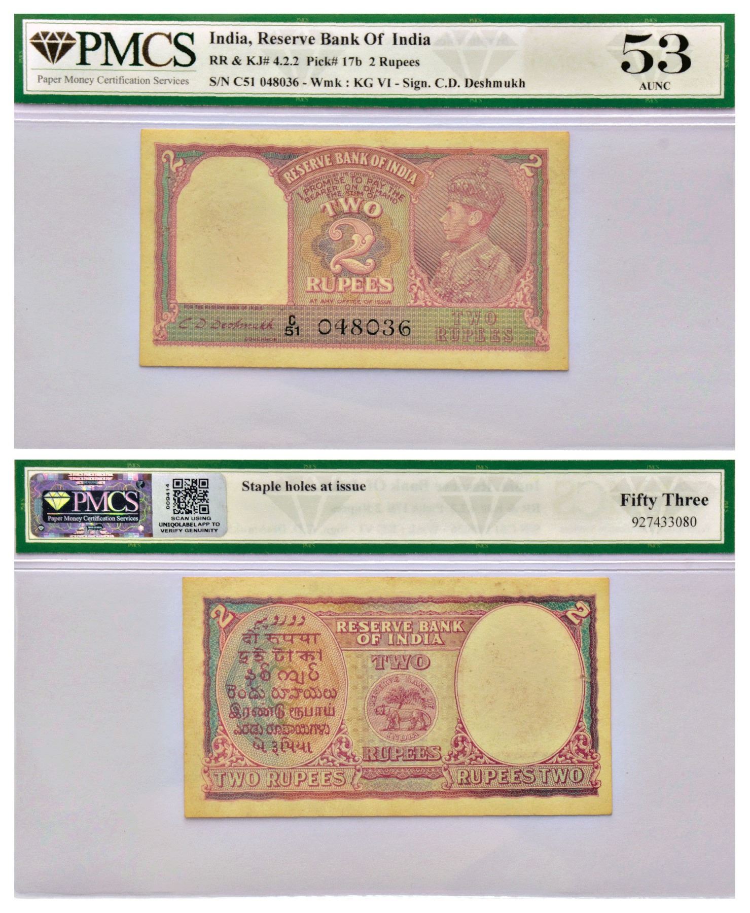 British India, George VI, 2 rupees, ND (1943), signed by C.D. Deshmukh, serial nos.: C51 048036 in black, J&R 4.2.2.