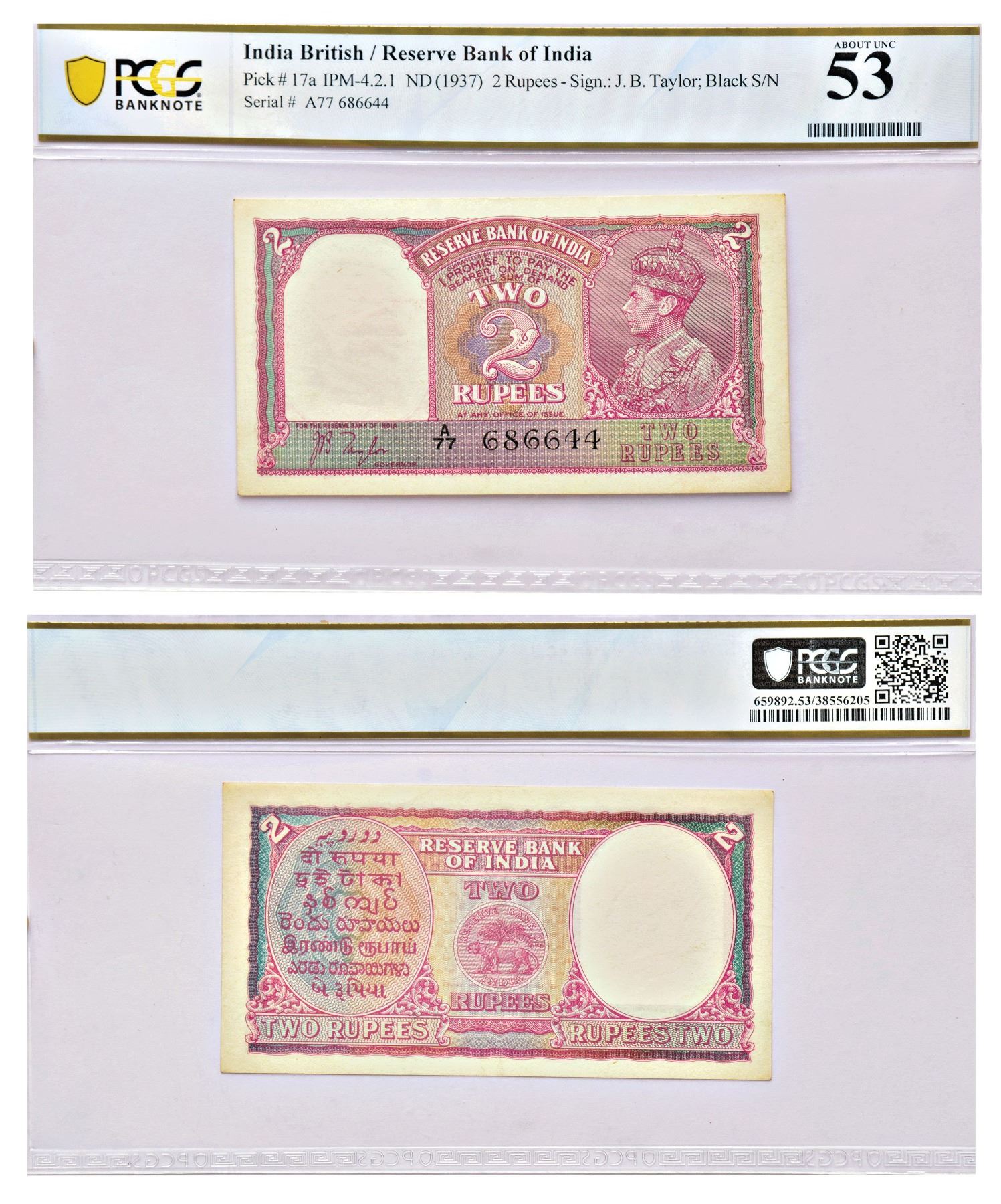 British India, George VI, 2 rupees, ND (1943), signed by J.B. Taylor, serial no.: A77 686644 in black, J&R 4.2.1.