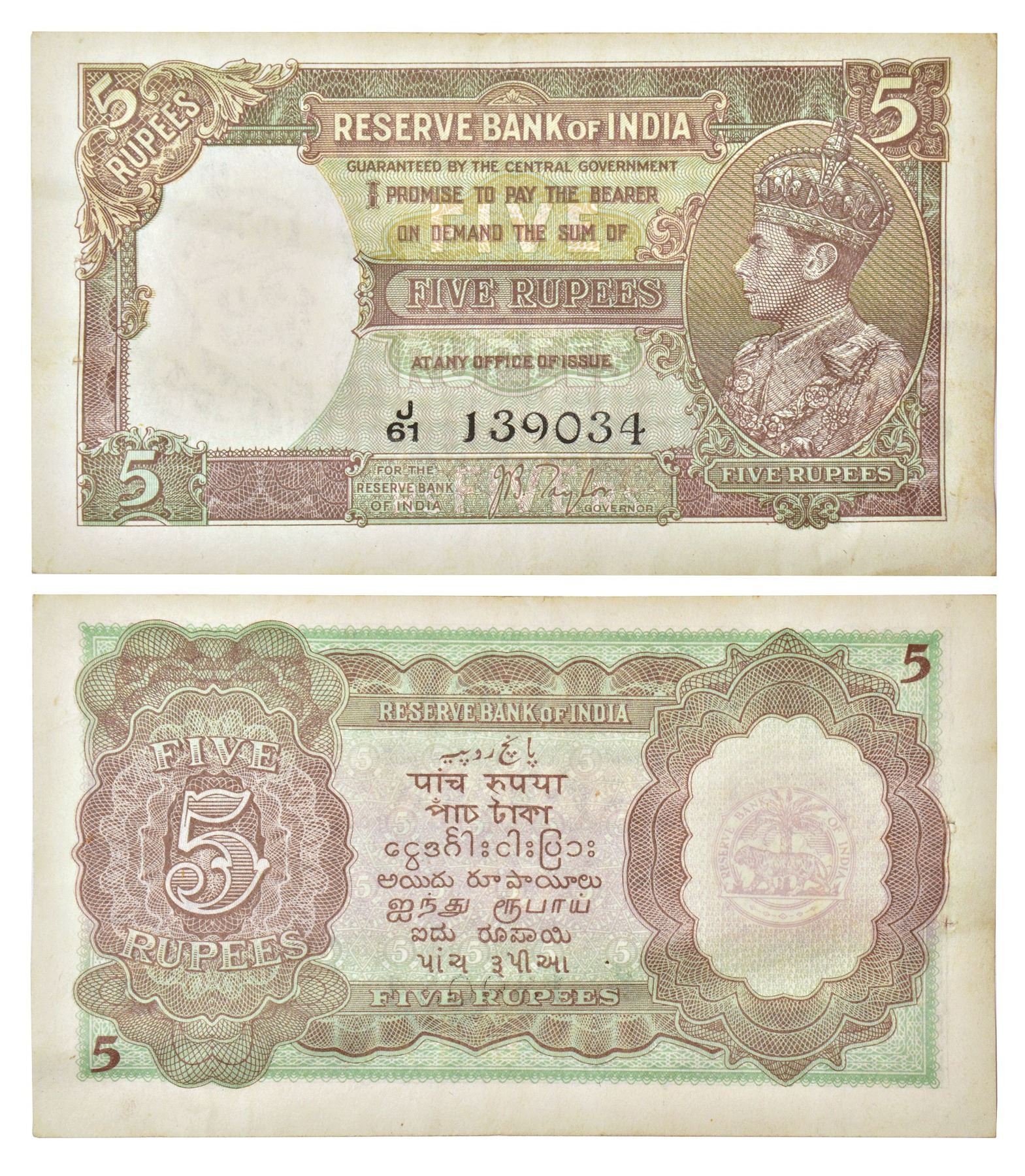 British India, George VI, 5 rupees, 1st issue, ND (1938), signed by J.B. Taylor, serial no.: J61 139034, J&R 4.3.1.
