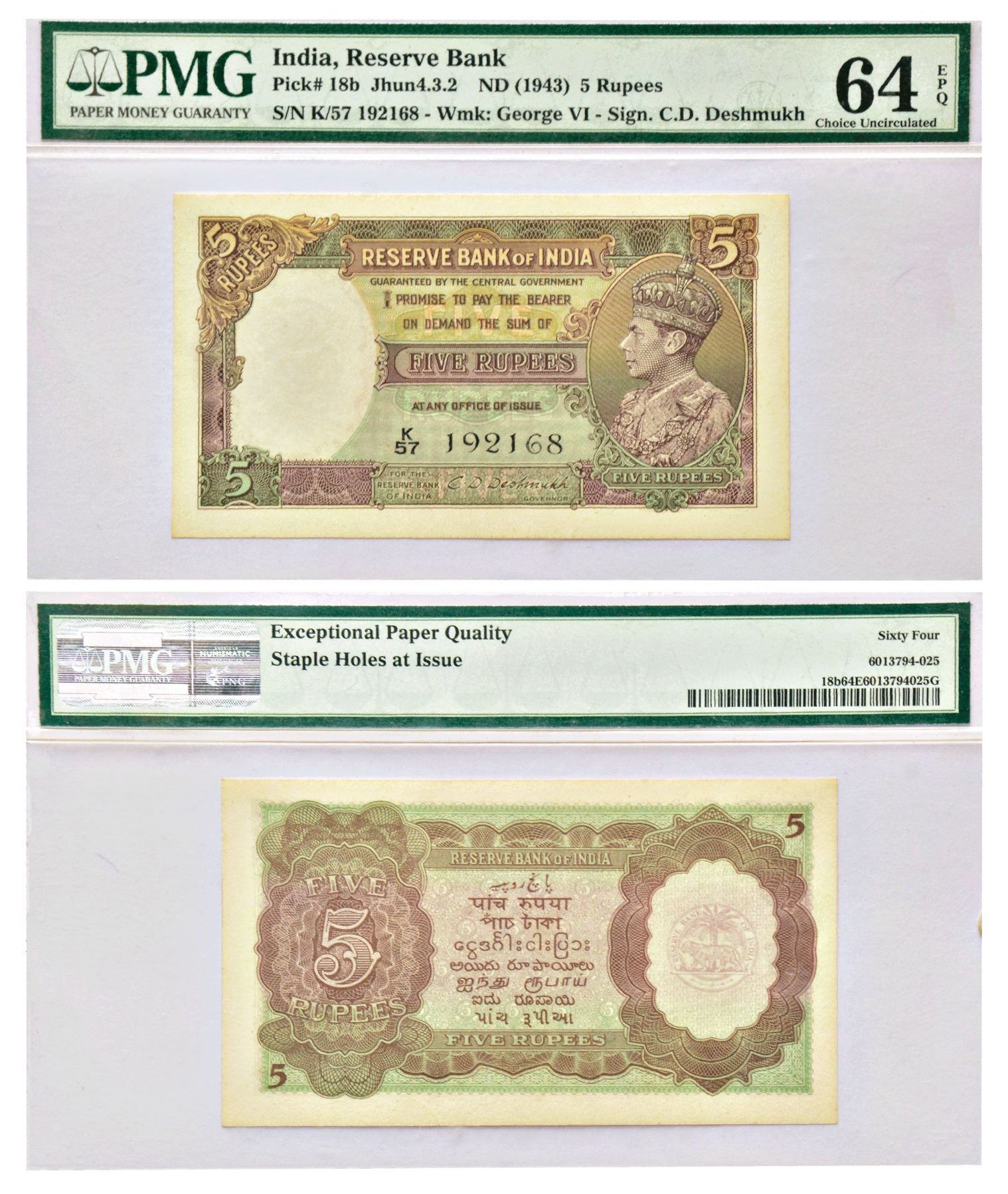 Paper Money: British India, George VI, 5 rupees, 1st issue, ND (1944), signed by C.D. Deshmukh,