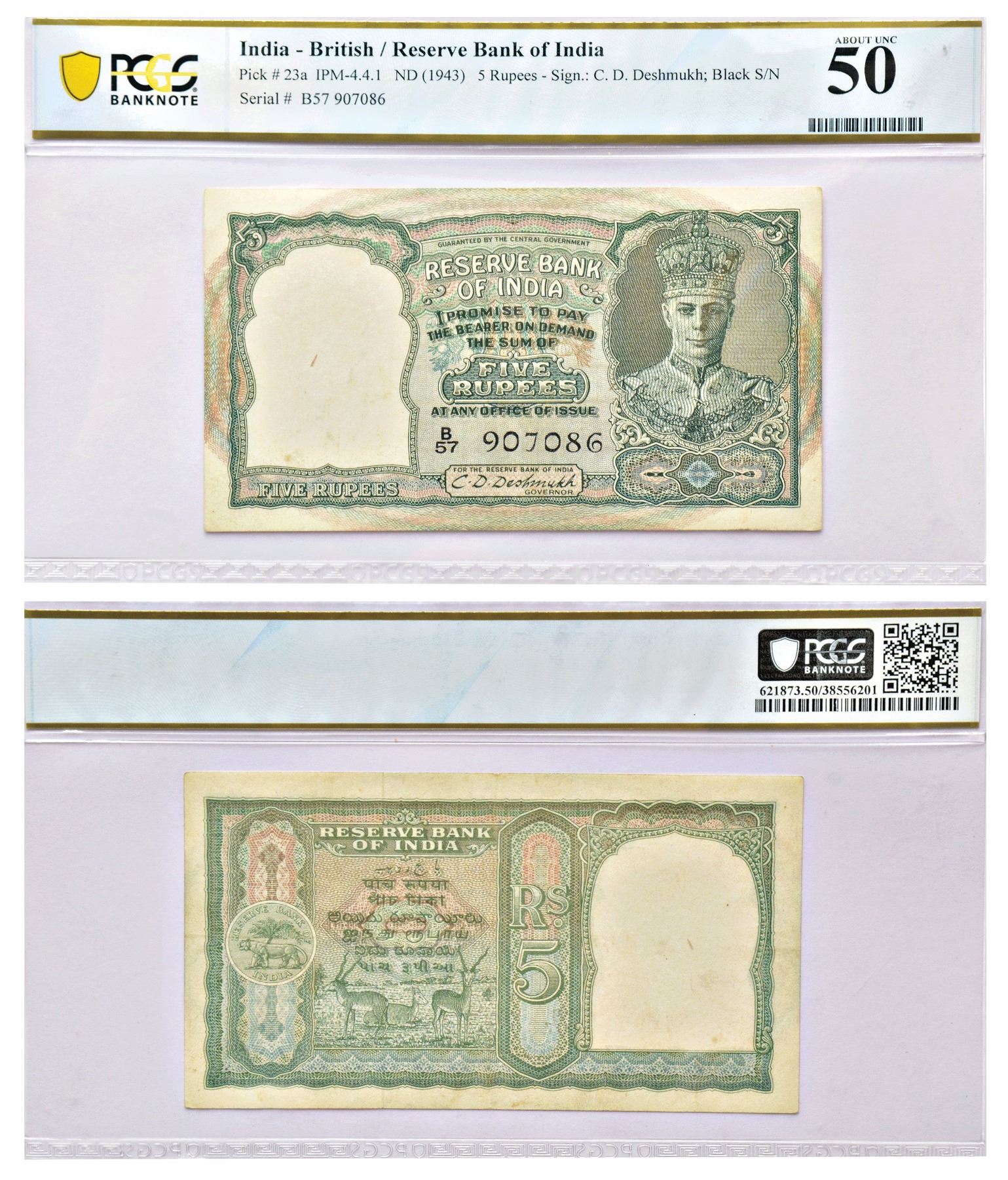 British India, George VI, 5 rupees, 2nd issue, ND (1944), signed by C.D. Deshmukh, serial no.: B57 907086 in black, J&R 4.4.1.