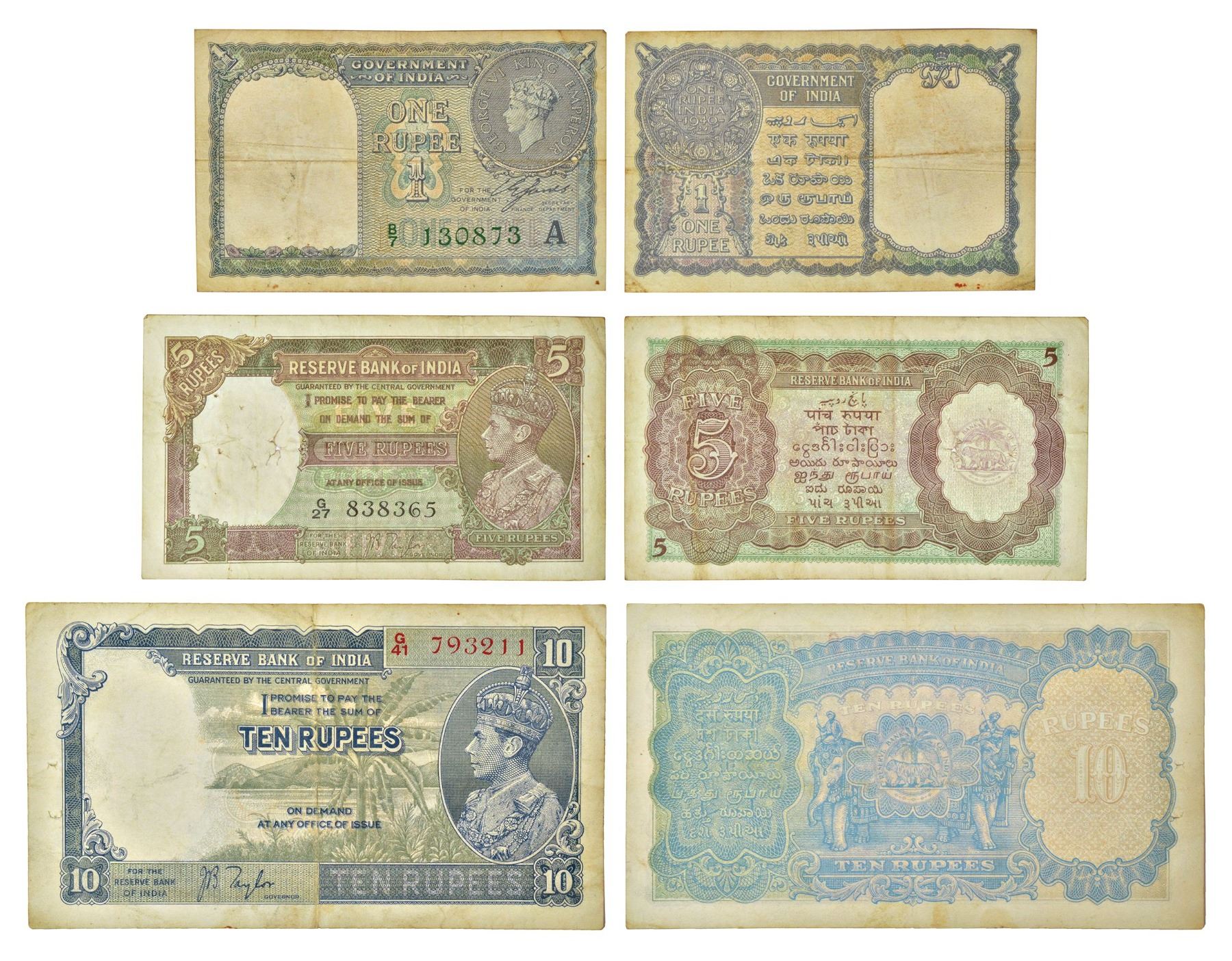 British India, George VI, set of 3 notes, (a) 1 rupee, 1940, signed by C.E. Jones, serial no.: B7 130873 in green; (b) 5 rupees, ND (1938) signed by J.B. Taylor, serial no.: G27 838365 and (c) 10 rupees, ND (1938), signed by J.B. Taylor, serial no.: G41 793211. (3 notes)