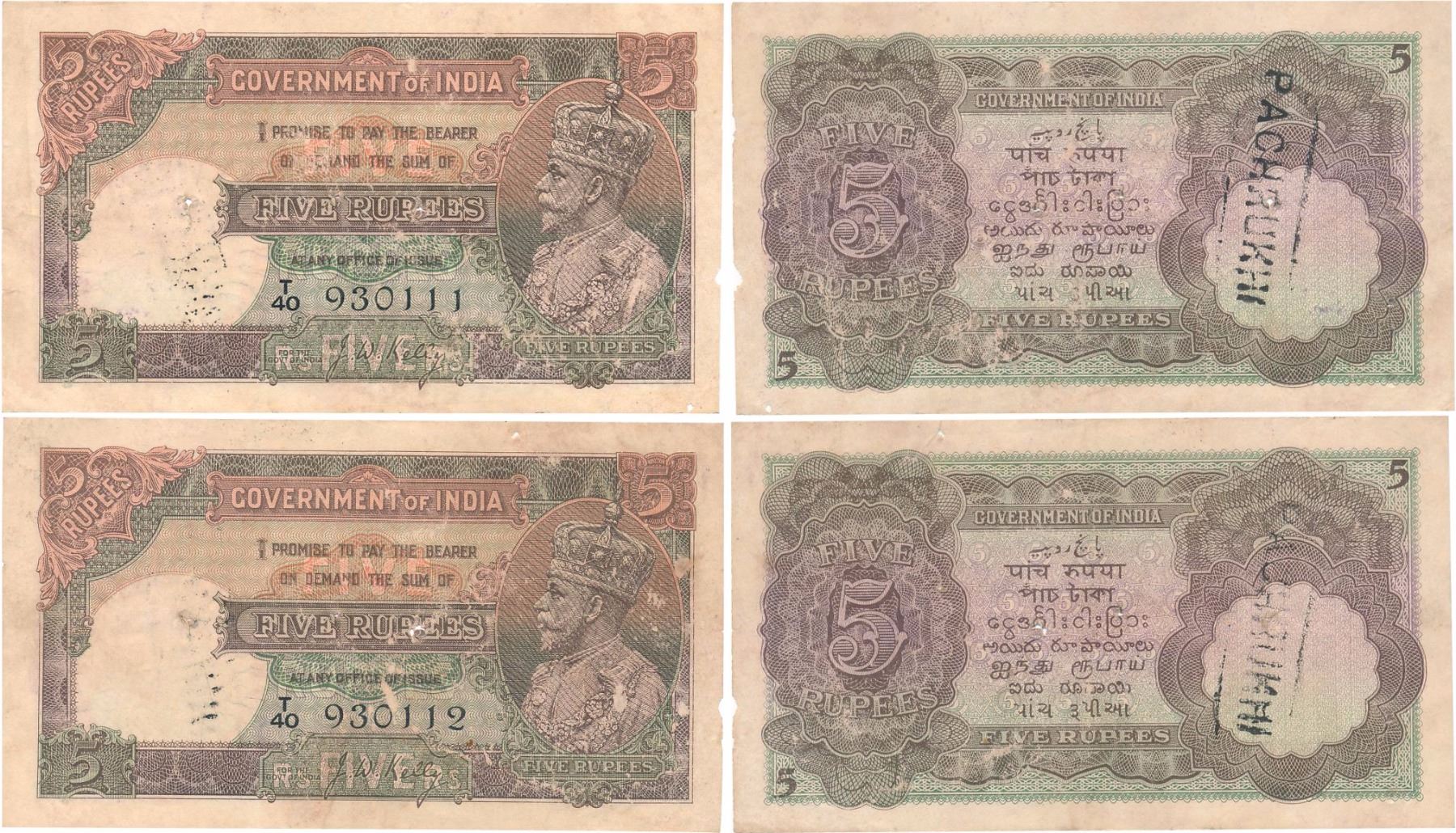 George V, Rupees 5, Consecutive 2 Notes, 2nd issue, Type 5, Signed J W Kelly, Prefix T/40 (Jhun# 5.2). Folded, usual pin hole, thread hole, rubber stamp on reverse, very fine. 2 Notes