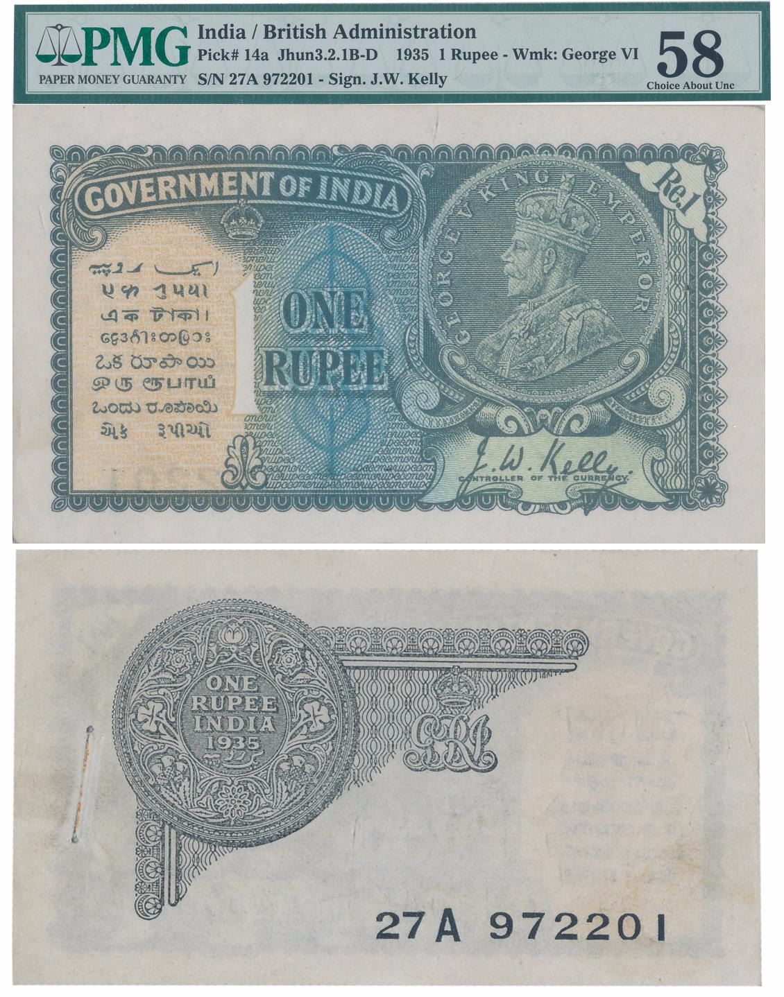 George V, Rupee 1, 2nd issue, Type 2, Signed J W Kelly, Prefix 27A (Jhun# 2.1B). Certified & Graded by PMG as 58 Choice about UNC.