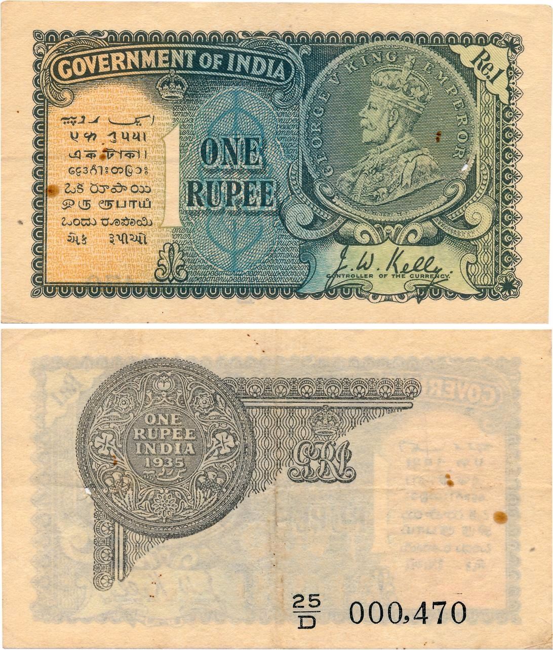 George V, Rupee 1, 2nd issue, Type 2, Signed J W Kelly, Prefix 25D (Jhun# 2.1D). Usual pin hole, very fine+, rare.