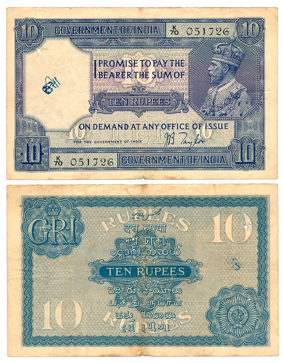 George V, Rupees 10, 2nd issue, Type 3.7, Signed J. B. Taylor, Prefix K/70 (R IPM# 3.7.2). Very fine.