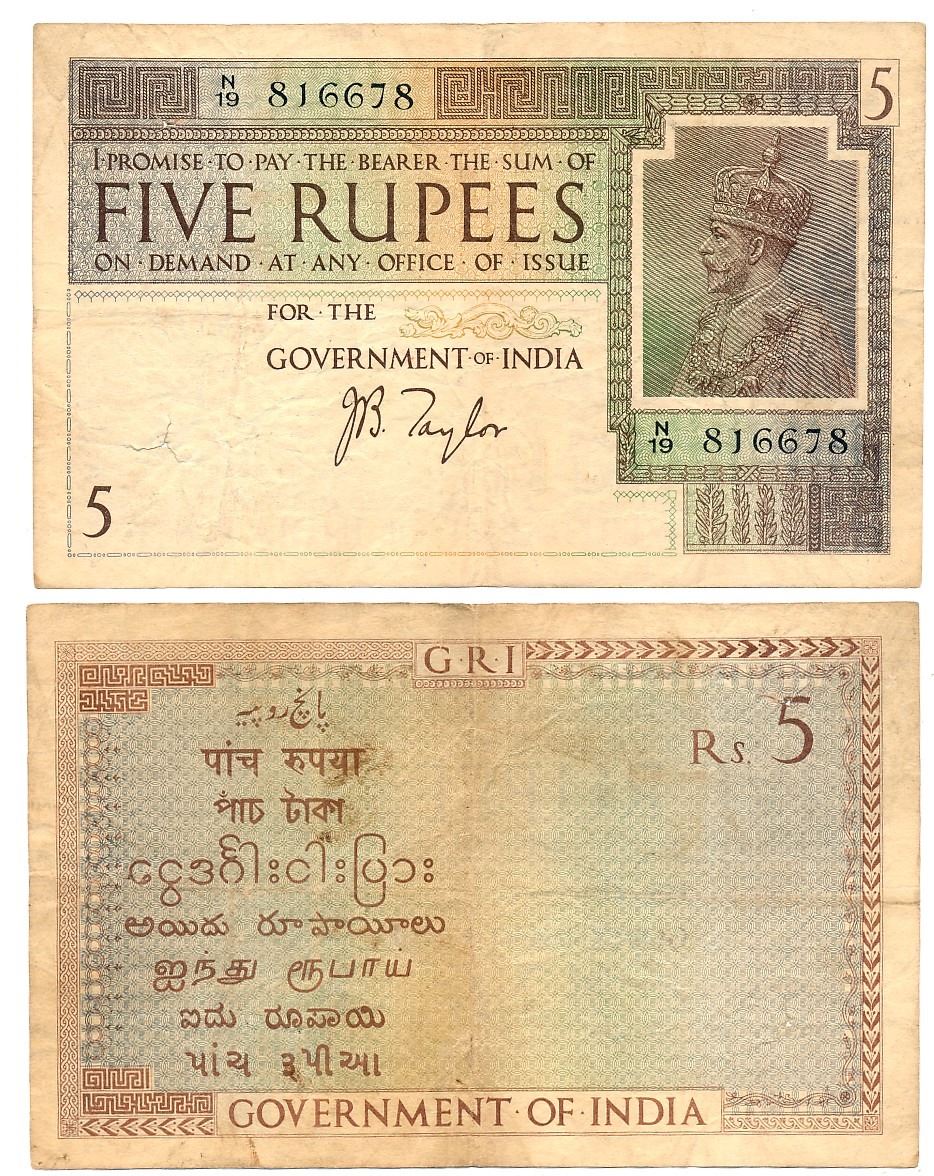 George V, Rupees 5, 1st issue, Type 3.4, Signed J. B. Taylor, Prefix N/19, Watermark variety B (R IPM# 3.4.2). Very fine.