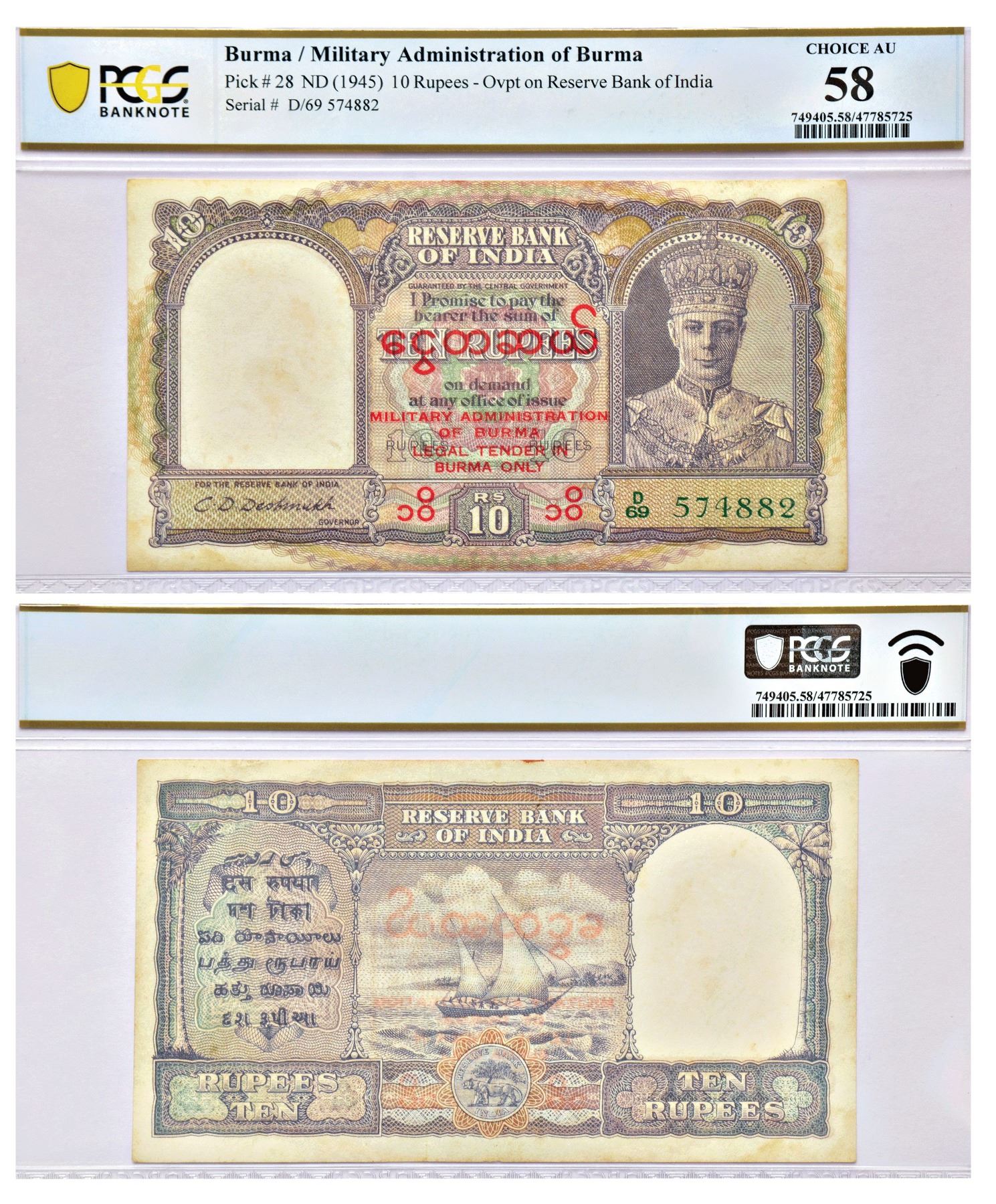 Paper Money: Burma, George VI, 10 rupees, ND (1945), signed by C.D. Deshmukh, serial no.: D69 574882 in green, Burmese text above and Military Administration/of Burma/Legal Tender in/Burma Only in five lines in red overprint, J&R 5.11B.1.