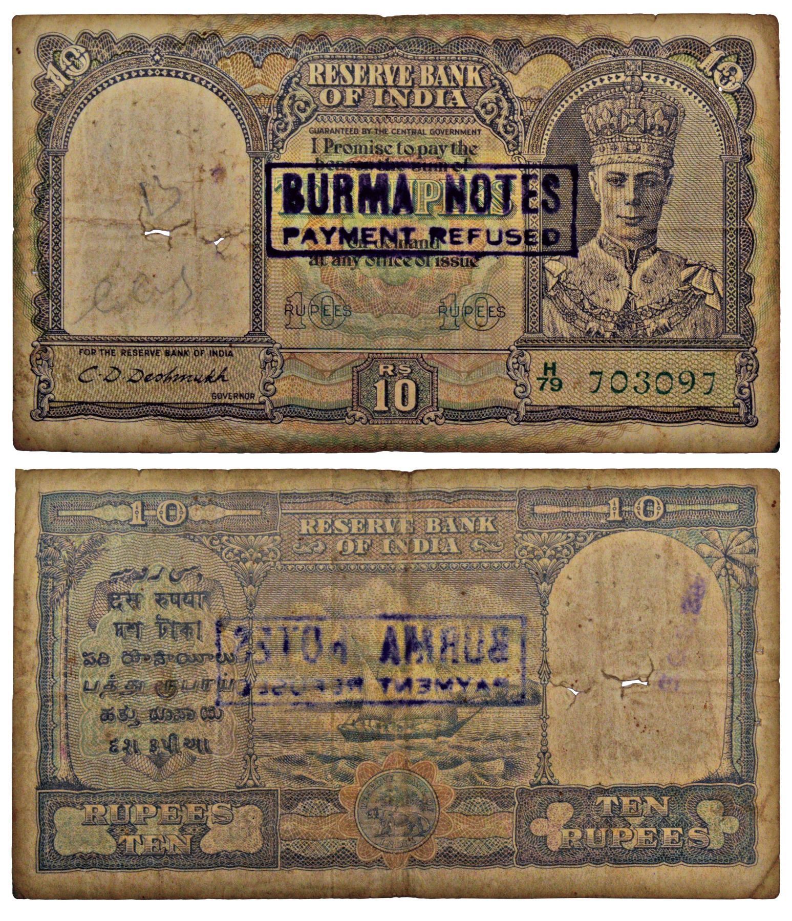 Burma, George VI, 10 rupees, ND (1947), signed by C.D. Deshmukh, serial no.: H79 703097, BURMA NOTES/PAYMENT REFUSED blue bank stamped on obverse, J&R 5.15.1, thread hole, upper right corner tattered.