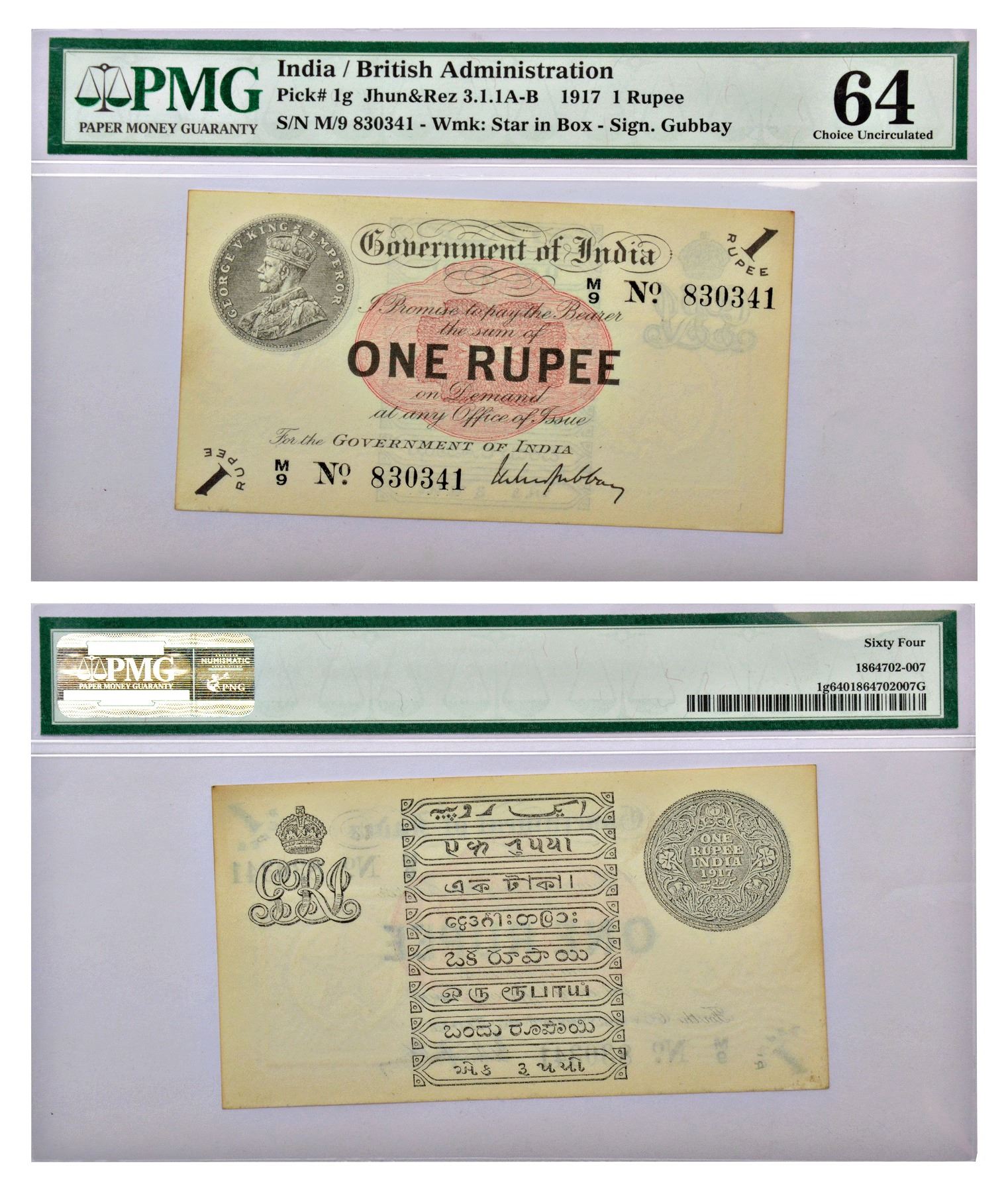 George V, 1 rupee, 1st issue, Madras circle, 1917, signed by M.M.S. Gubbay, serial no.: M9 830341, watermark 'Enclosed Star' wrong Gujarati, printed in England, J&R 3.1.1A.