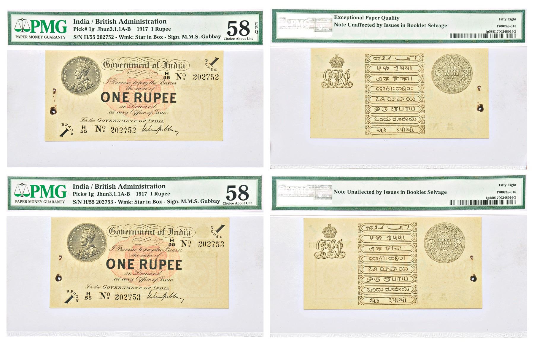 George V, 1 rupee (2), 1st issue, Universalized circle, 1917, signed by M.M.S. Gubbay, two consecutive serial no.: H55 202752 and 202753, watermark 'enclosed star', correct Gujarati, printed in England, J&R 3.1.1B. (2 notes)
