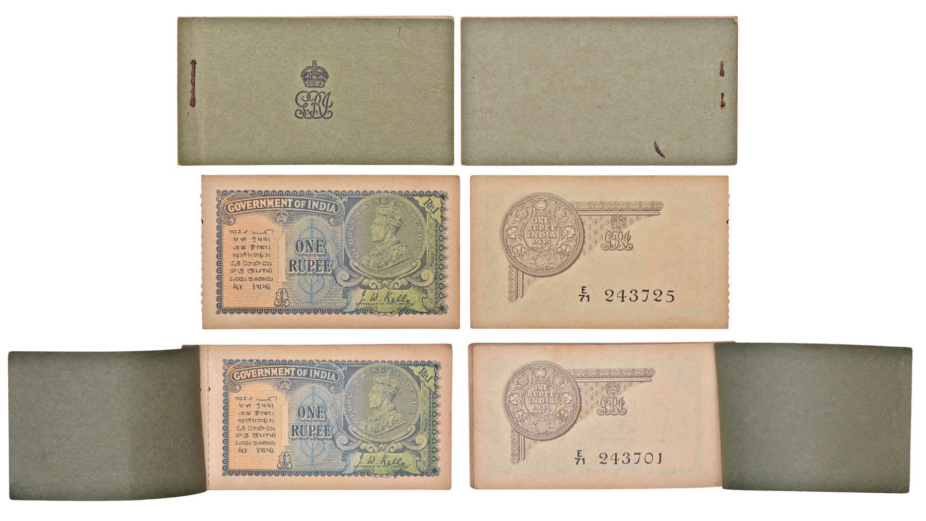 George V, 1 rupee, 2nd issue, 1935, complete booklet of 25 notes, signed by J.W. Kelly, serial no.: E71 243701 to 243725, J&R 3.1.2A. 1st note is detached from the perforation; within original cover. (25 notes)