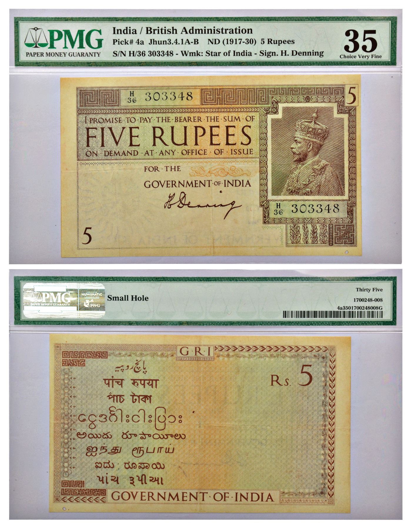 George V, 5 rupees, 1st issue, ND (1925), signed by H. Denning, serial no.: H36 303348, watermark 'Variety A', printed in England by Bank of England Press, J&R 3.4.1A.