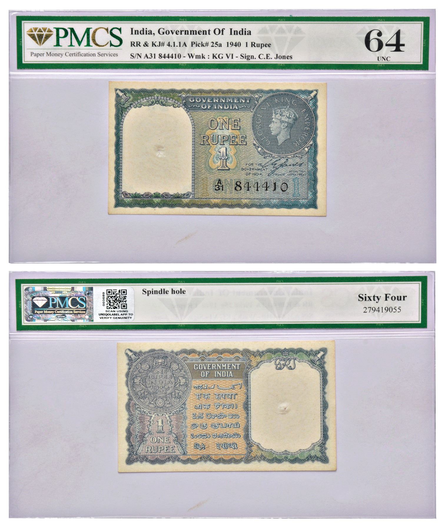 George VI, 1 Rupee, 1940, signed by C.E. Jones, without inset, serial no.: A31 844410, in black, J&R 4.1.1A.