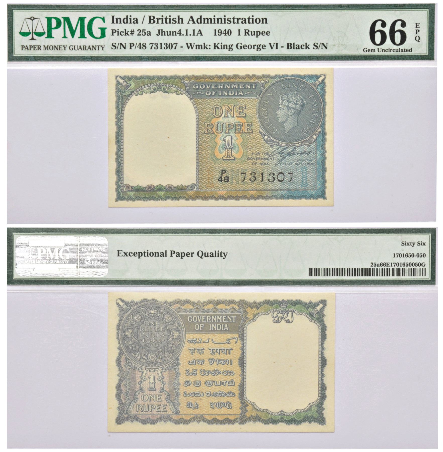 George VI, 1 rupee, 1940, signed by C.E. Jones, without inset, serial no.: P48 731307, in black, J&R 4.1.1A.