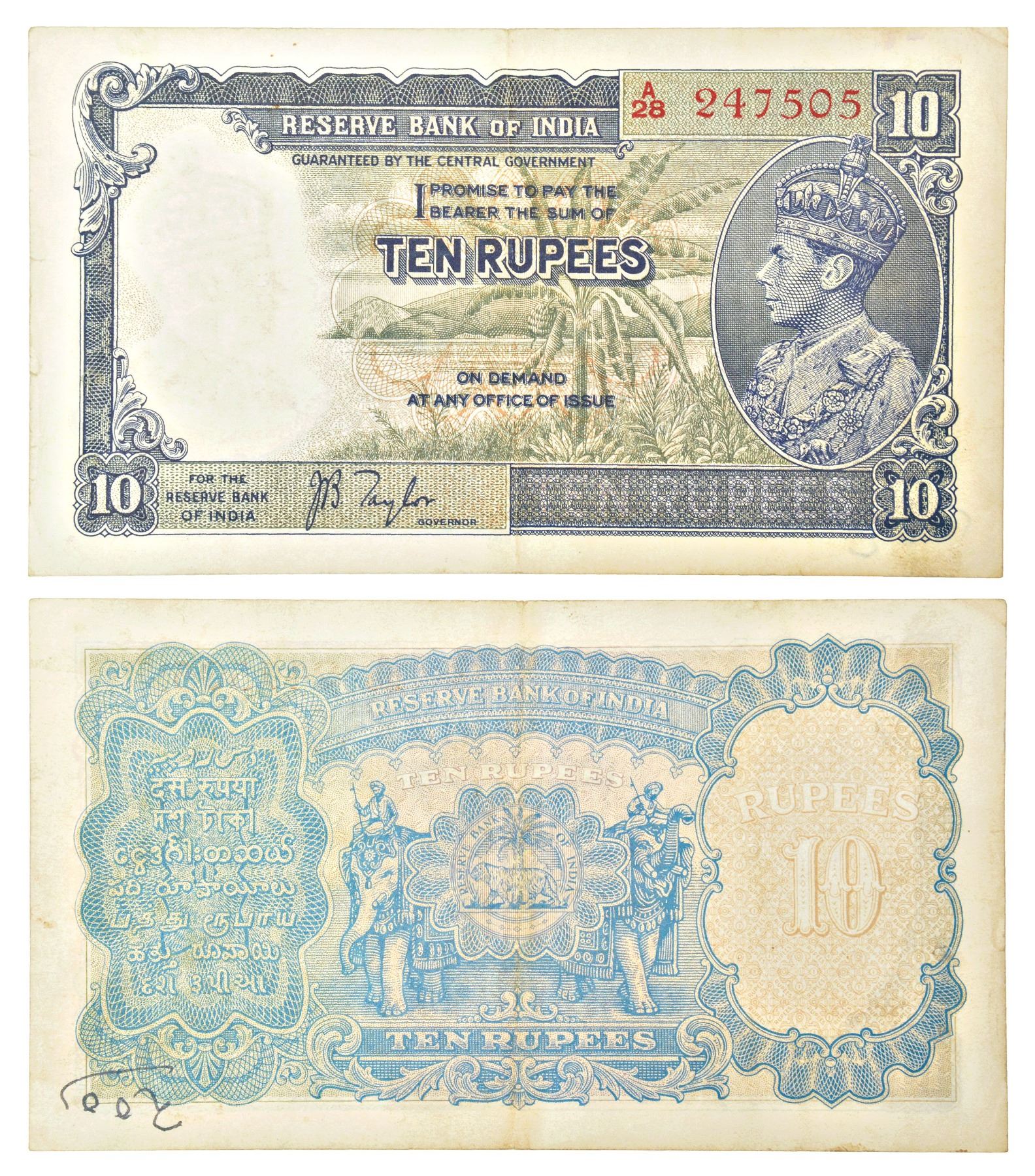George VI, 10 rupees, 1st issue, ND (1938), signed by J.B. Taylor, serial no.: A28 247505, J&R 4.5.1. Ink