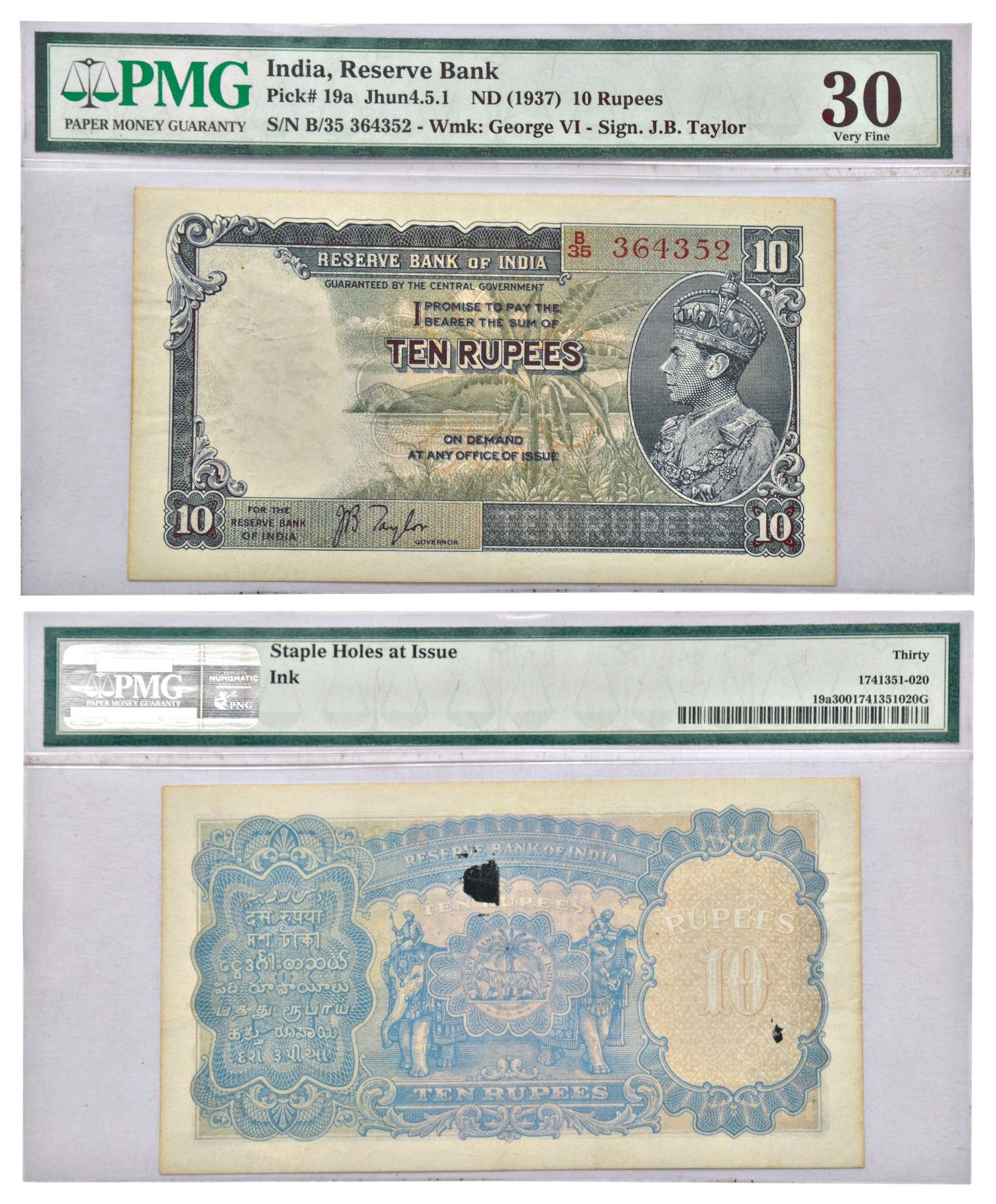 George VI, 10 rupees, 1st issue, ND (1938), signed by J.B. Taylor, serial no.: B35 364352. J&R 4.5.1.