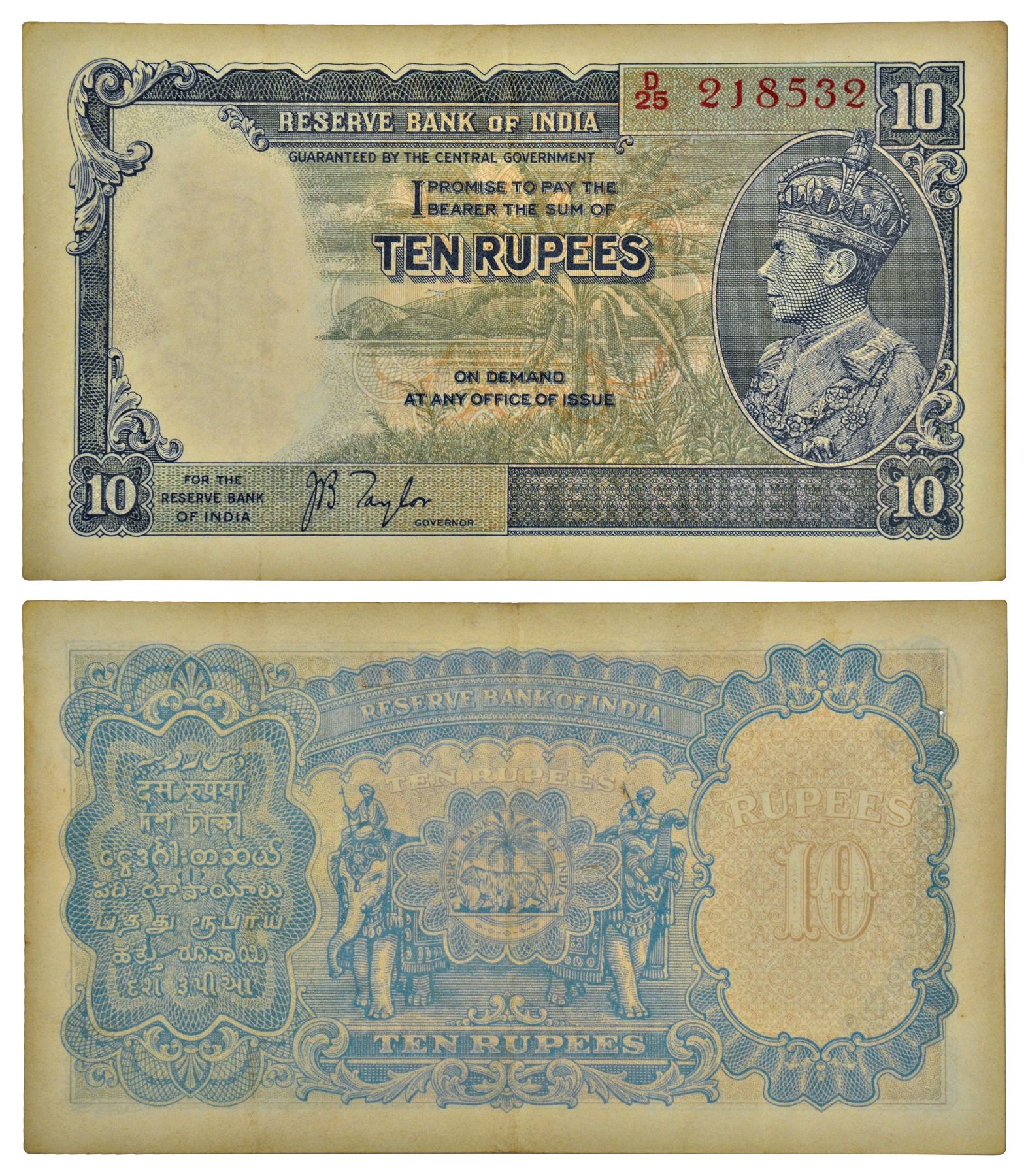 George VI, 10 rupees, 1st issue, ND (1938), signed by J.B. Taylor, serial no.: D25 218532. J&R 4.5.1, pin holes.