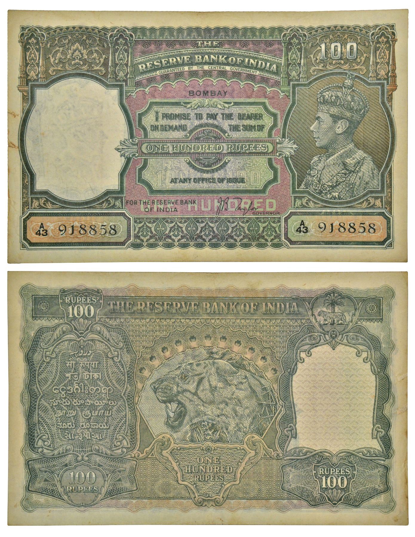 George VI, 100 rupees, ND (1938), Bombay Circle, signed by J.B. Taylor, Serial No.: A43 918858 in black, Watermark 'Profile head'. J&R 4.7.1A.