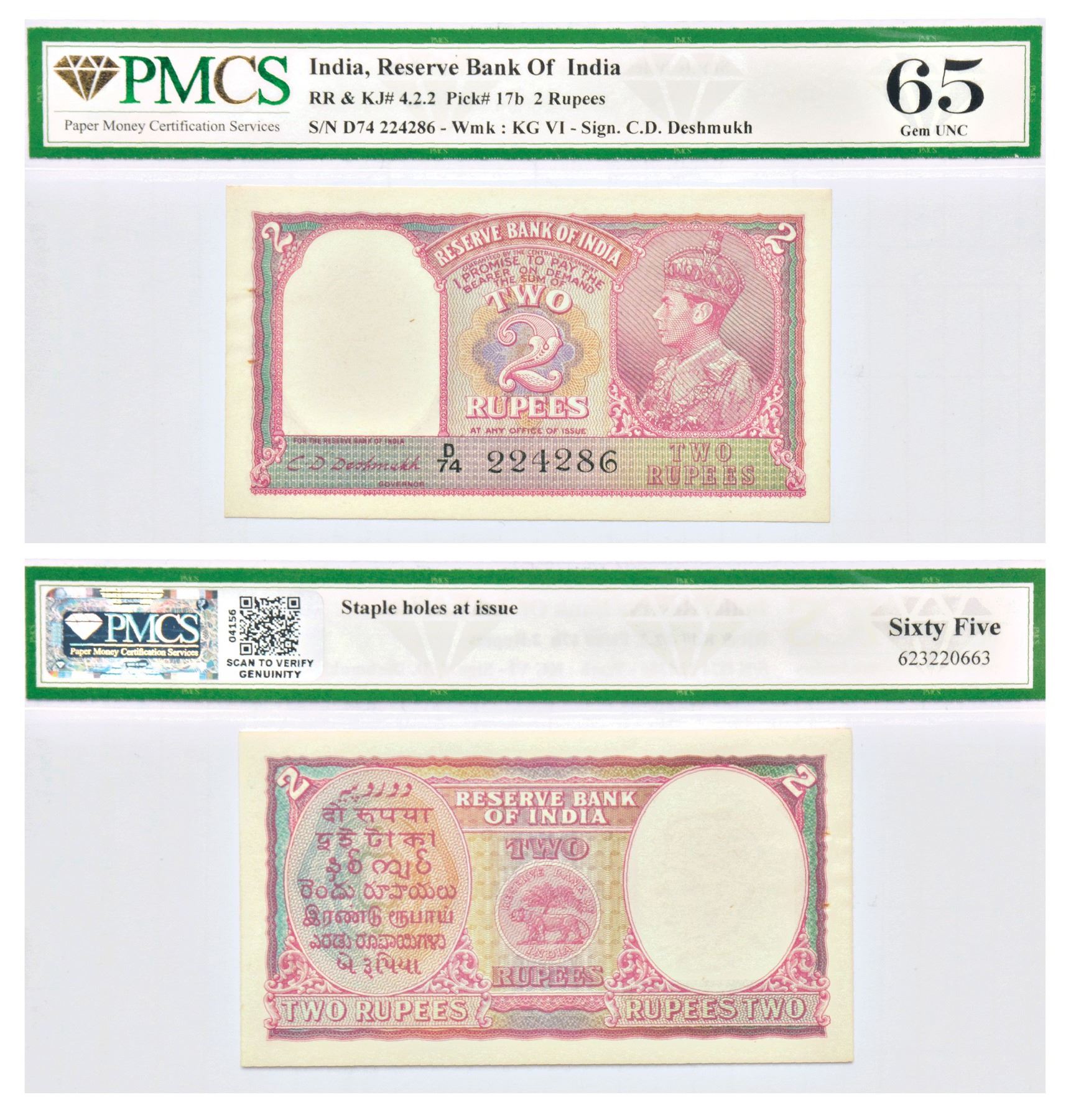 George VI, 2 rupees, ND (1943), signed by C.D. Deshmukh, serial no.: D74 224286 in black, J&R 4.2.2, staple holes at issue.