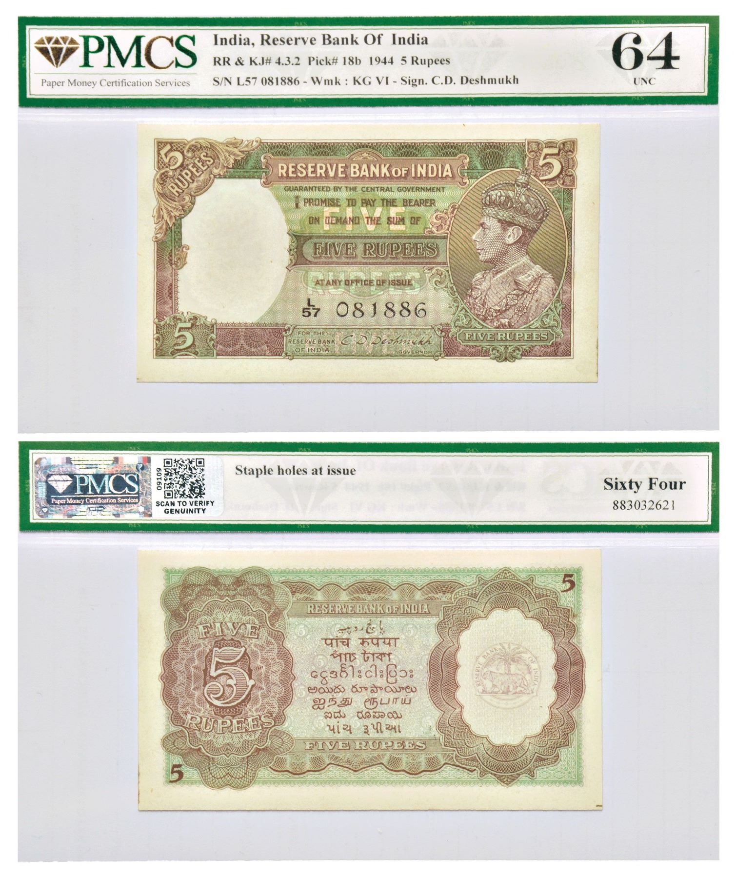 George VI, 5 rupees, 1st issue, ND (1944), signed by C.D. Deshmukh, serial no.: L57 081886, J&R 4.3.2.