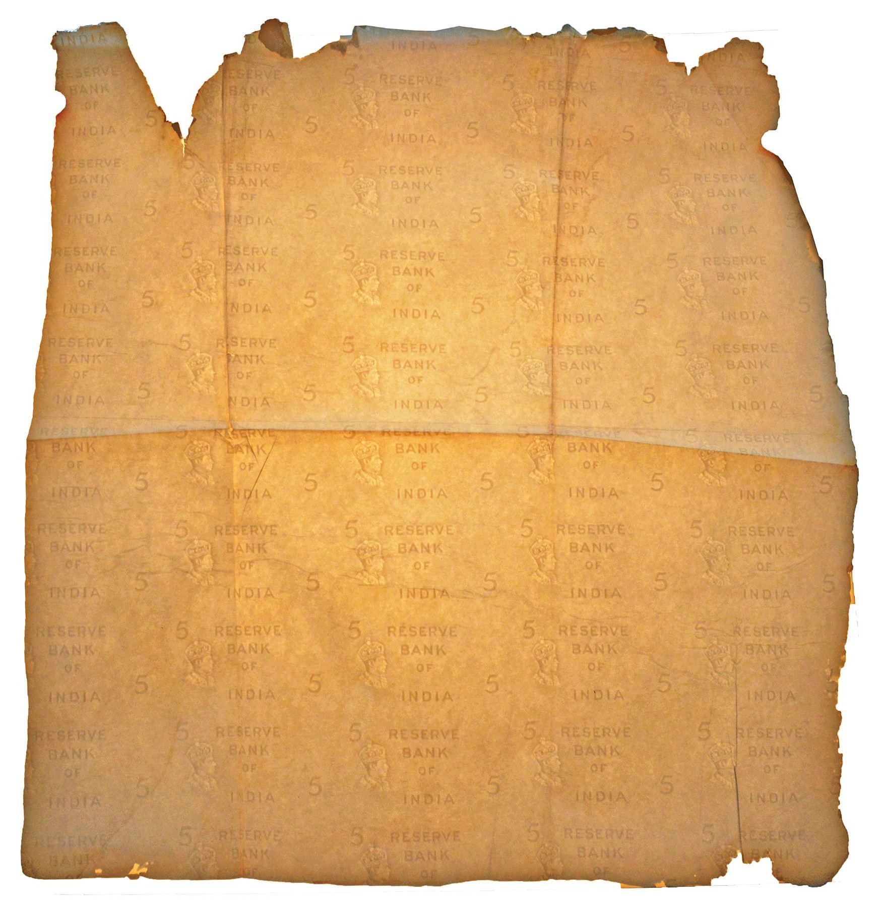 George VI, water marked sheet of 5 rupees, written Reserve/Bank/of/India in four lines, 25 to 30 watermarks with rough borders.