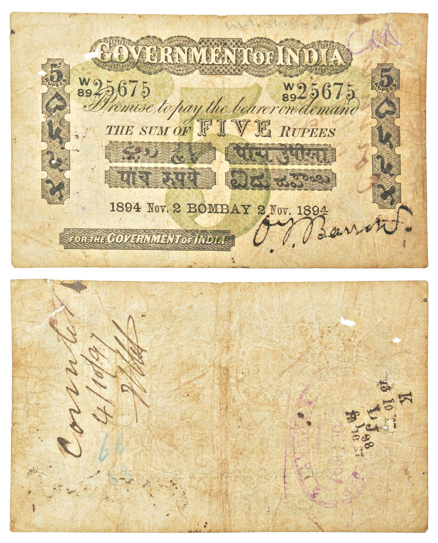 Government of India, Victoria, uniface, 5 rupees, 1st issue, Bombay circle, green underprint, dated 2 November 1894, signed by O.T. Barrow, serial no.: W89 25675, two serial numbers, J&R 2A.1.1D.5.