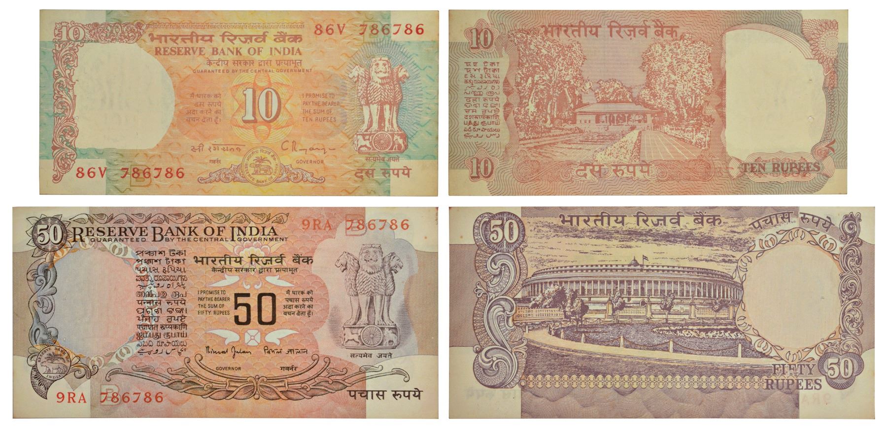 Group of 2 fancy number notes, 1x 10 rupees, Shalimar Garden series, signed by C. Rangarajan, inset 'B' & 1x 50 rupees, Parliament House series, signed by Bimal Jalan, inset 'B', both notes serial no.: 786786. (2 notes)