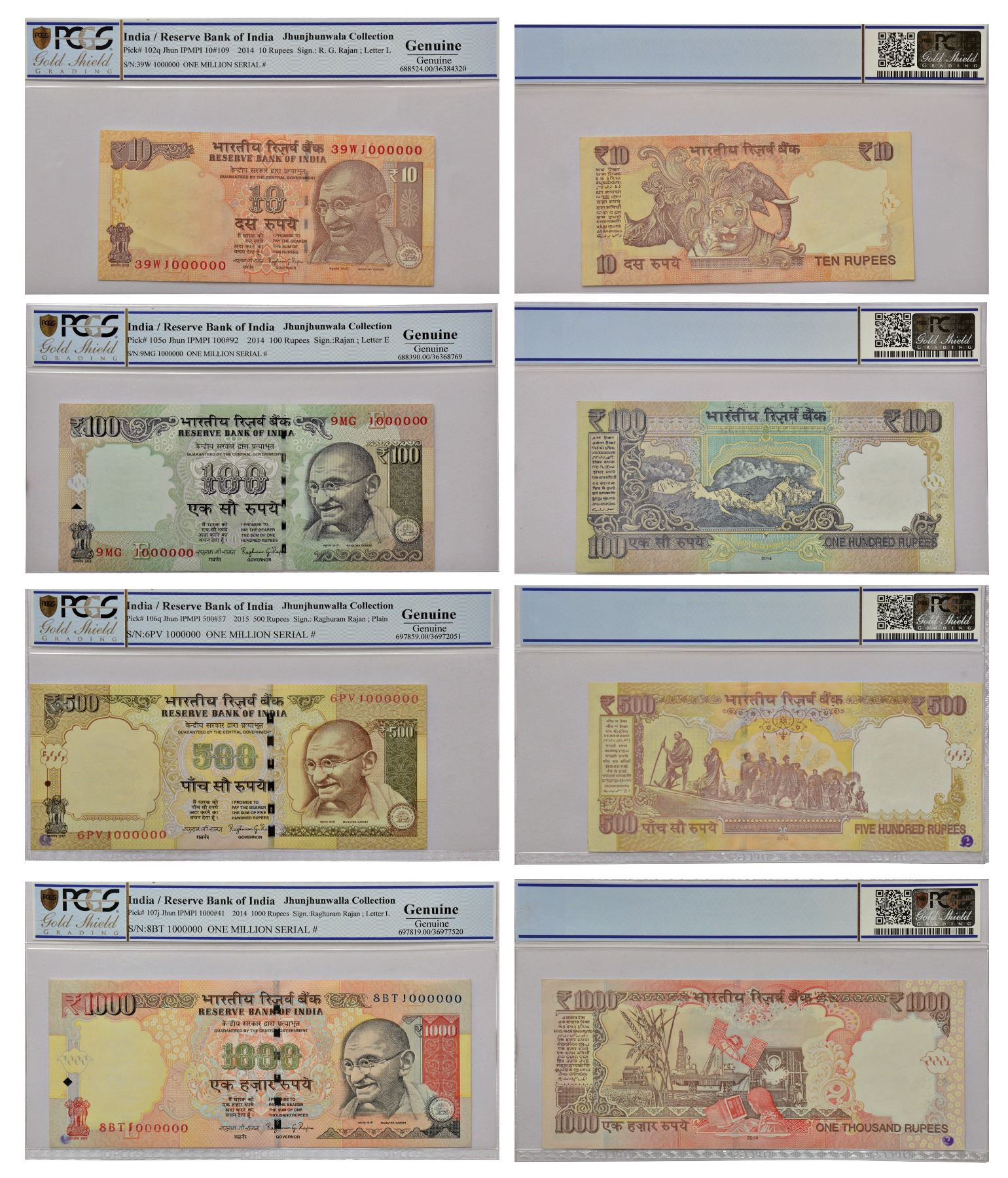 Group of 4 fancy number notes, Gandhi series, signed by Raghuram Rajan, 1x 10 rupees, 2014, inset 'L', serial no.: 39W 1000000; 1x 100 rupees, 2014, inset 'E', serial no.: 9MG 1000000; 1x 500 rupees, 2015, without inset, serial no.: 6PV 1000000; and 1x 1000 rupees, 2014, inset 'L', serial no.: 8BT 1000000.(4 notes)