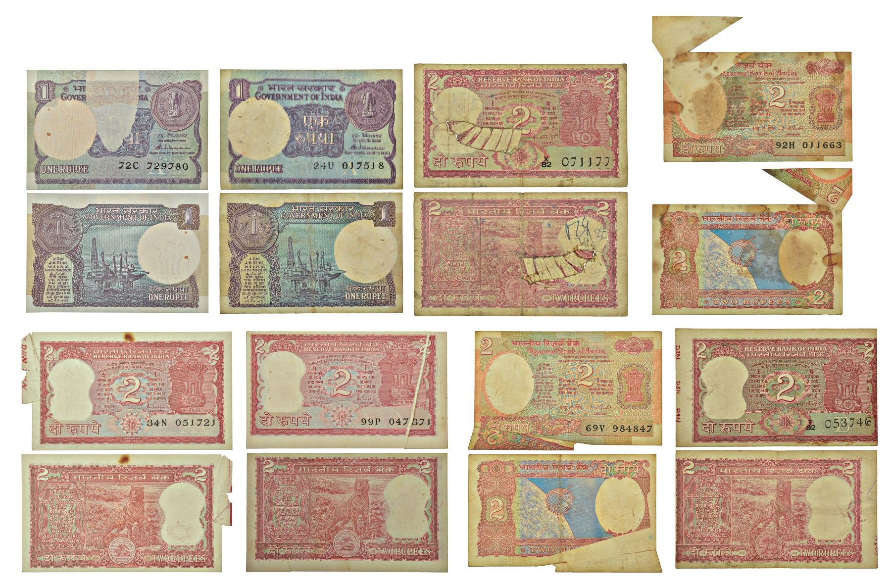Group of 8 misprint notes, 2x 1 rupee and 6x 2 rupees, various years, various governor's signature, various type of misprint, includes some part not printed, die shift, crease error, printing shift, extra paper, flip error, etc. (8 notes)