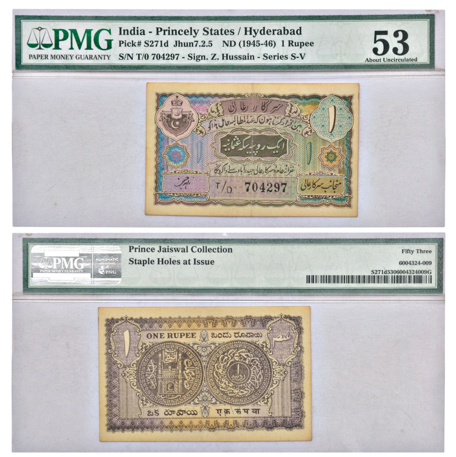 Hyderabad, 1 rupee, 2nd issue, ND (1943), signed by Zahid Hussain, serial no.: T/0 704297, 'sign 1' type, promise text in three lines in Urdu. J&R 7.2.5.