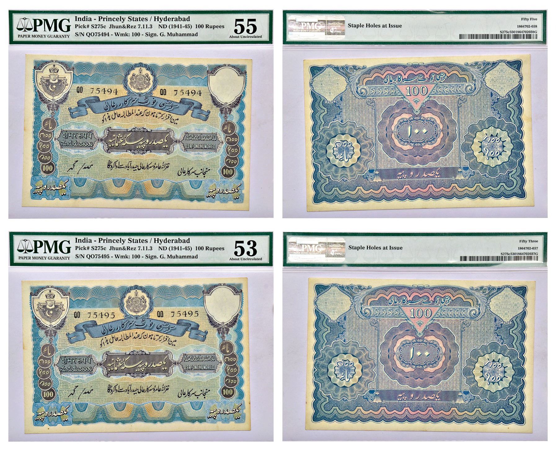 Hyderabad, 100 rupees (2), 2nd issue, ND (1939), signed by Ghulam Muhammad, sign '3' type, two consecutive serial no.: Q0 75494 and 75495, promise text in three lines in Urdu, printed in Nashik, J&R 7.11.3. (2 notes)