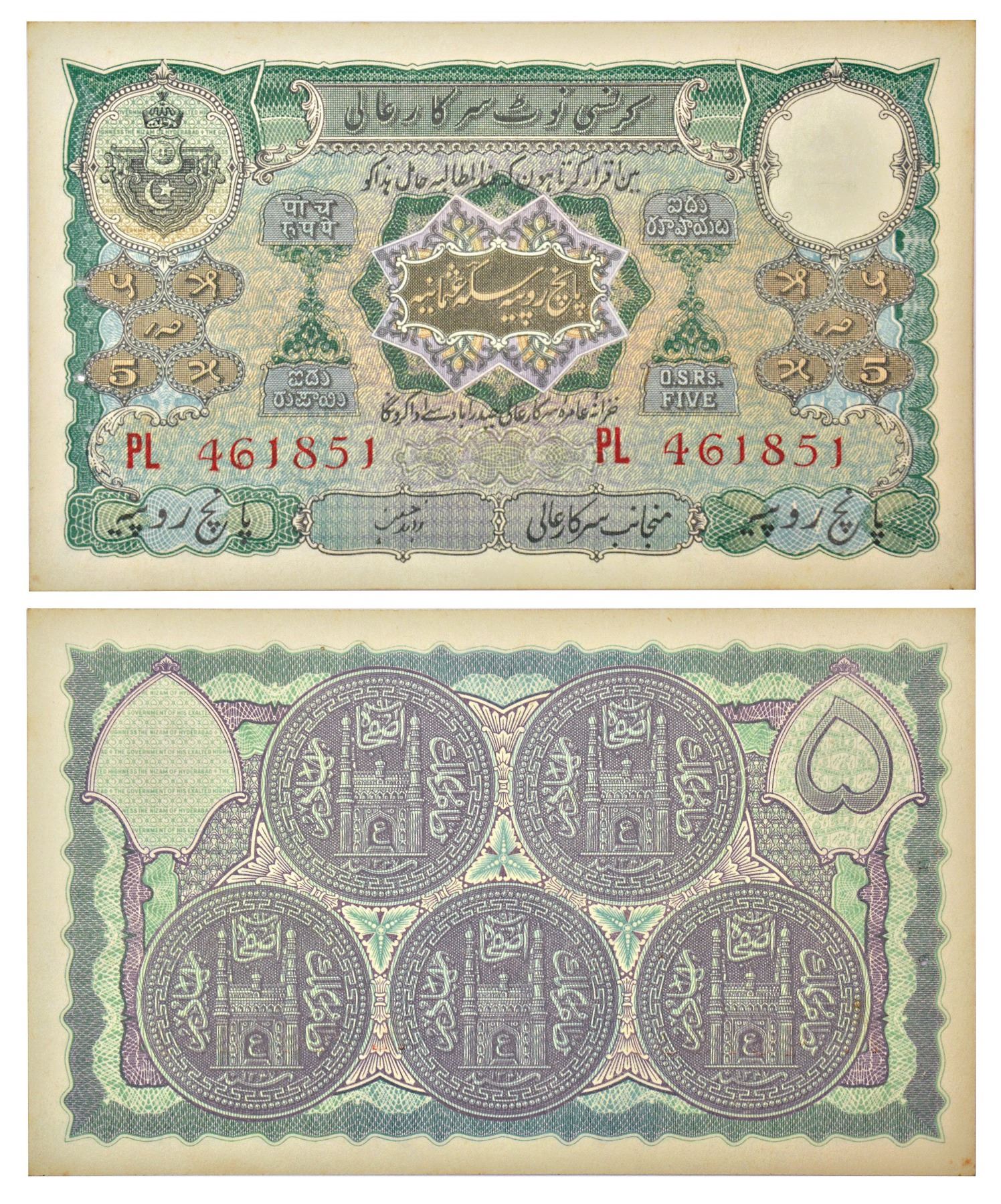 Hyderabad, 5 rupees, 2nd issue, ND (1939), signed by Zahid Hussain, 'sign 2' type, serial no.: PL 461851, promise text in three lines in Urdu, numeral 5 in English and Urdu in watermark panel, printed in Nashik. J&R 7.6.4.