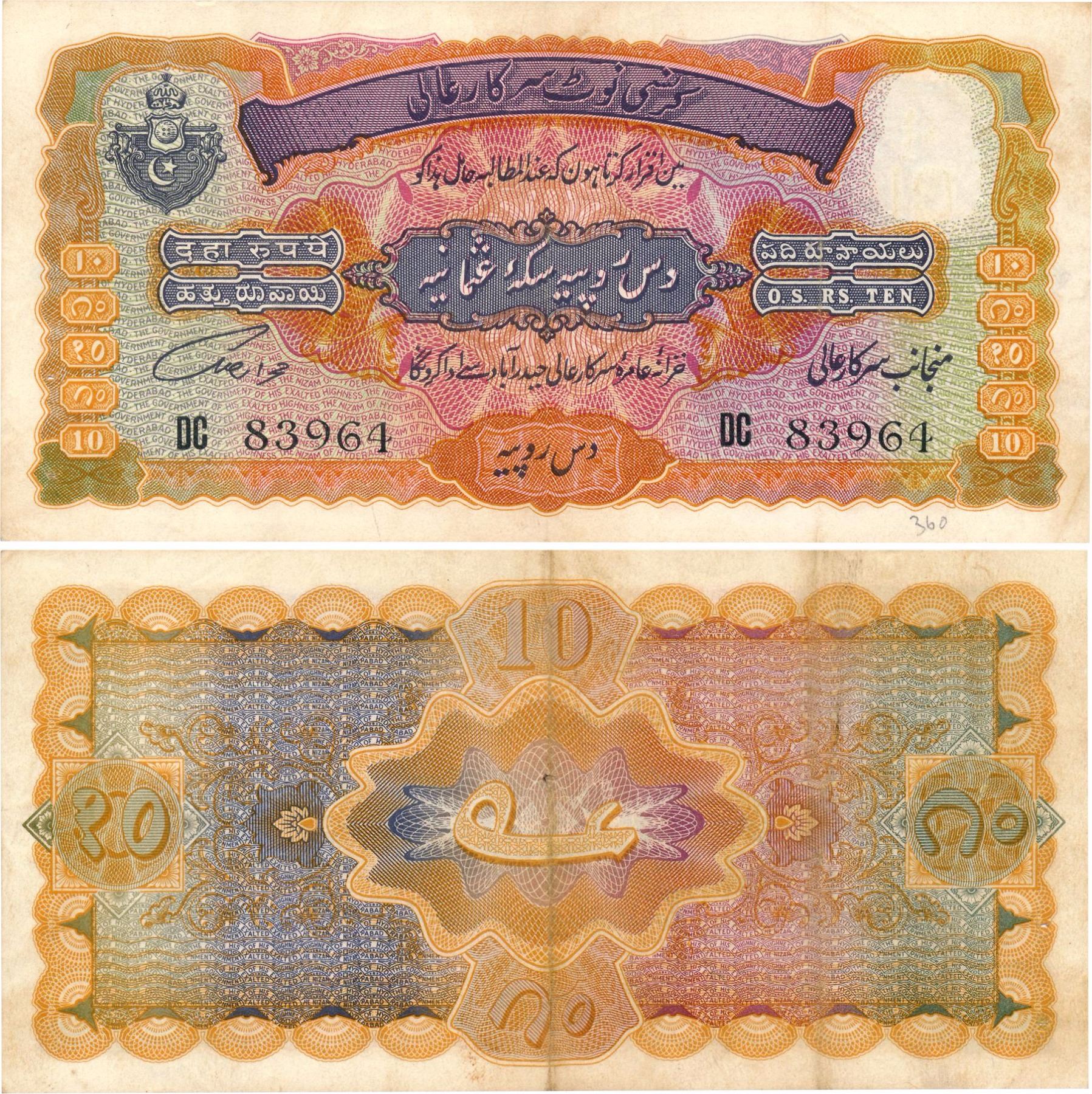 Hyderabad, Rupees 10, Type 9, 2nd issue, Signed Fakhr Yar Jung, Prefix DC (Jhun# 9.1A). Nice crisp paper, extremely fine, rare.